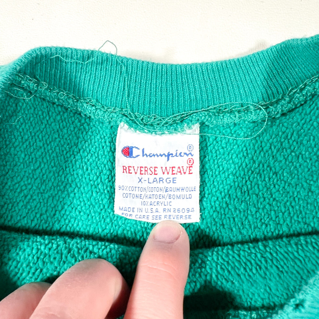vintage champion reverse weave green 90s crewneck sweatshirt usa made athletic streetwear hip hop retro heavyweight small c logo spellout cobblestore richmond va vintage clothing