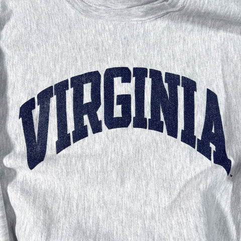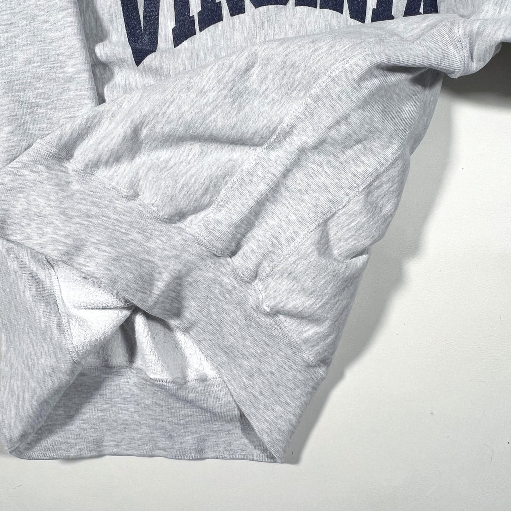 Classic 90’s Champion Reverse Weave sweatshirt featuring bold navy UVA collegiate lettering across the chest. Made in the USA with the iconic heavyweight fleece and side rib panels Champion is known for. Timeless heather grey colorway, perfect fade, and that true vintage fit.