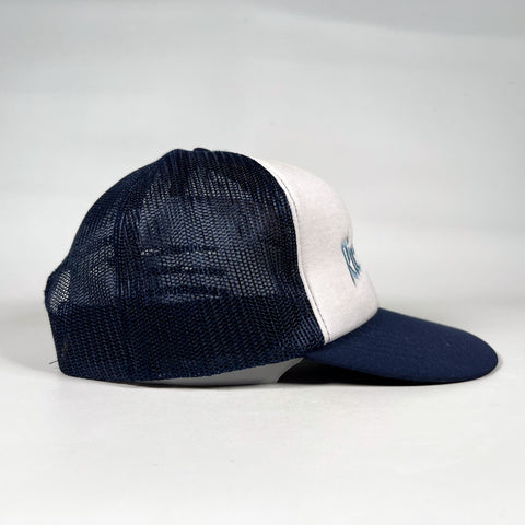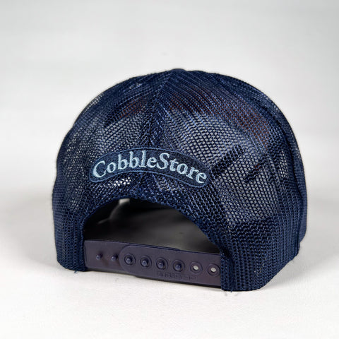 A vintage navy-and-white Richmond trucker hat featuring soft blue gothic embroidery across the front and matching CobbleStore embroidery on the back. Classic foam-front trucker construction with navy mesh panels and an adjustable snapback. Clean, crisp color combo with that true vintage feel.