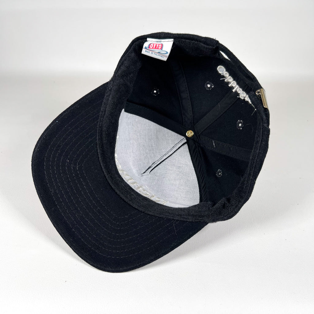 Color/Style: Black Cotton with off-white embroidery and a strapback closure.