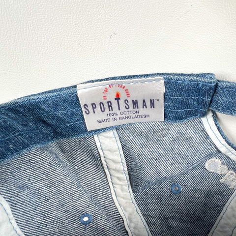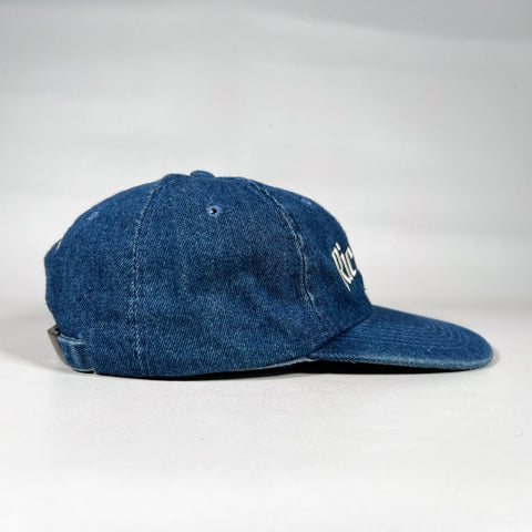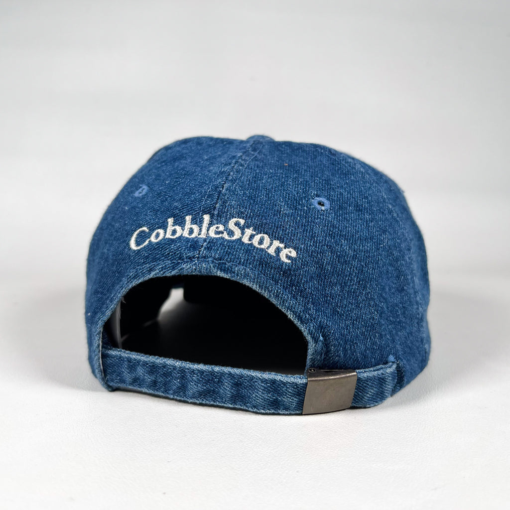 A classic deep-blue denim Richmond hat featuring crisp white gothic embroidery on the front and matching CobbleStore embroidery on the back. Finished with an adjustable metal slide strap and a perfectly worn-in brim, giving it that true vintage look and feel.