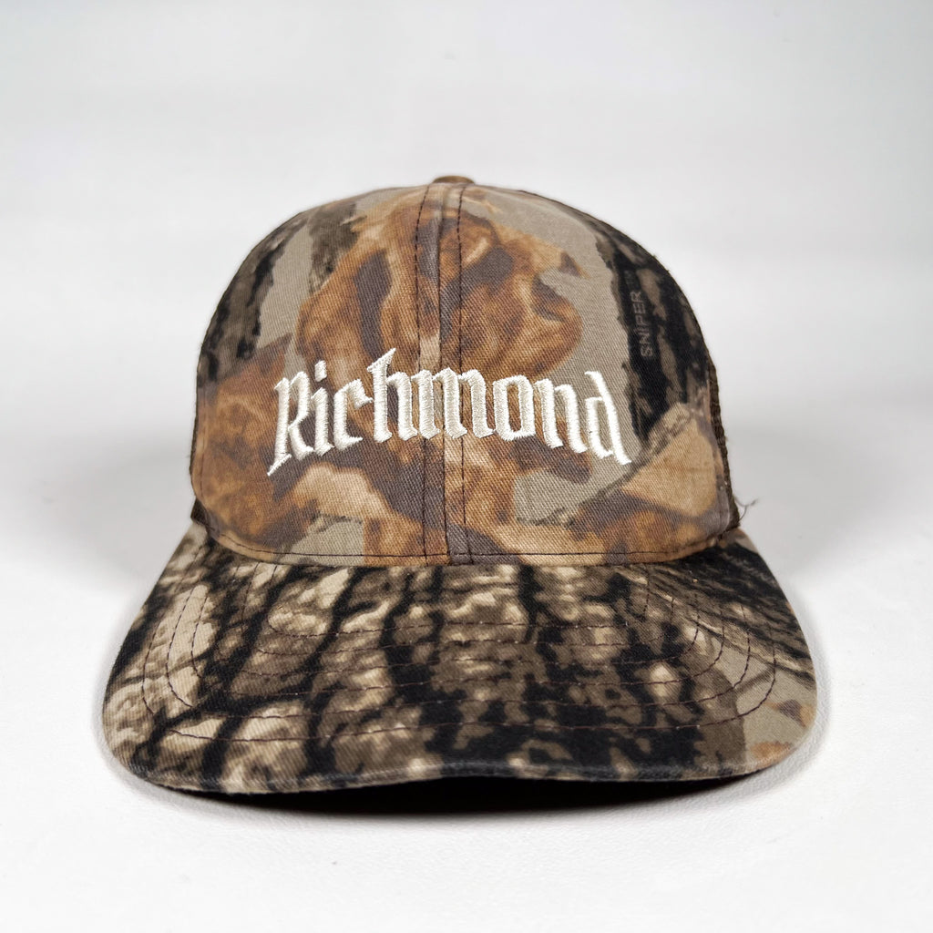 richmond hat camo trucker vintage mesh cap old english embroidery rva hunting camo hat retro style snapback cobblestore merch virginia apparel woodland camo cap