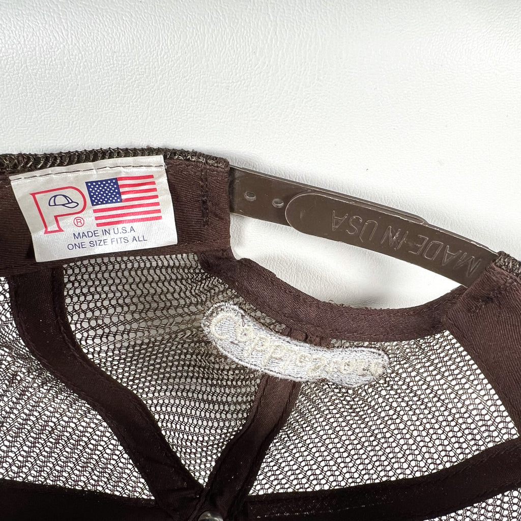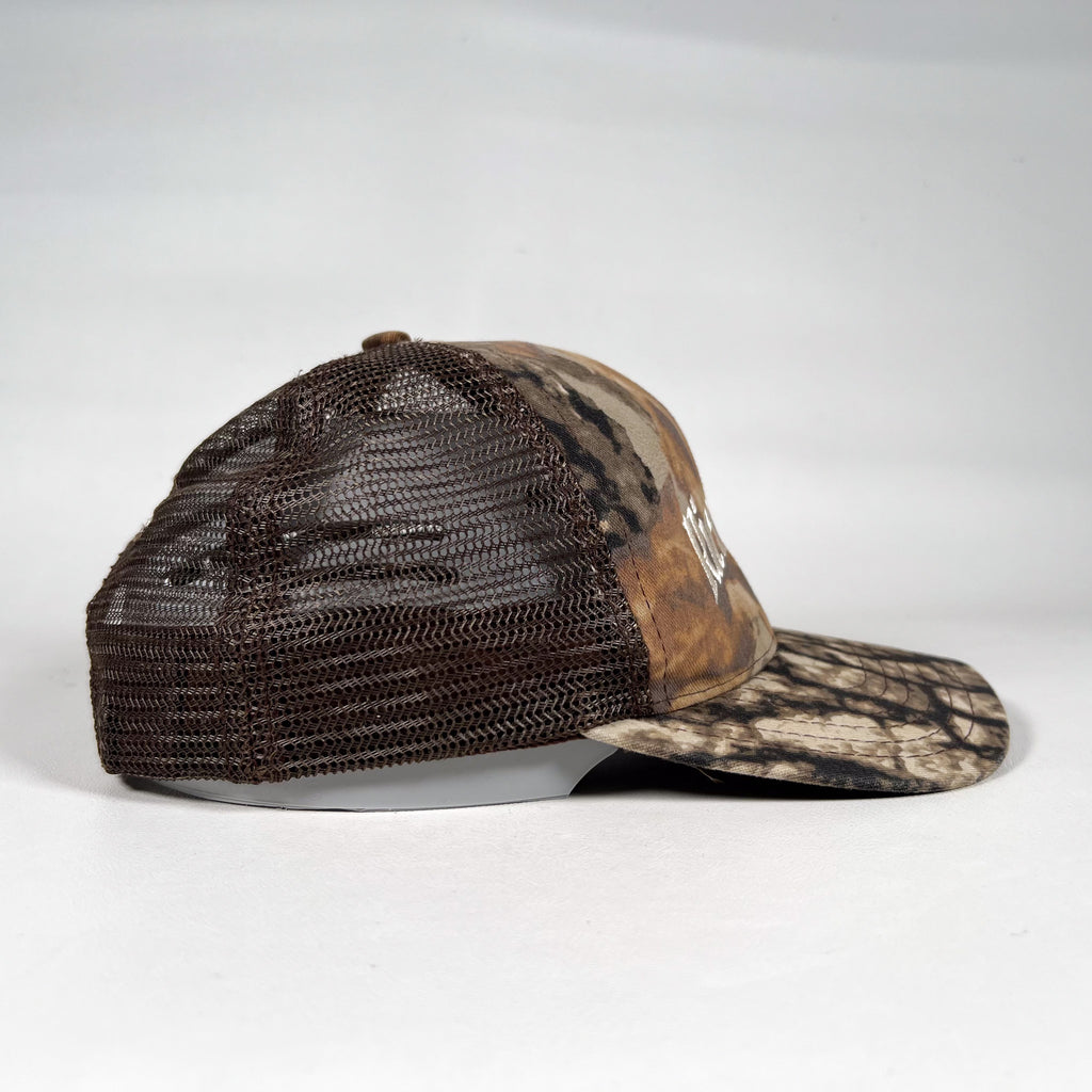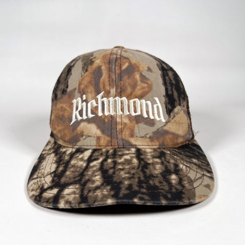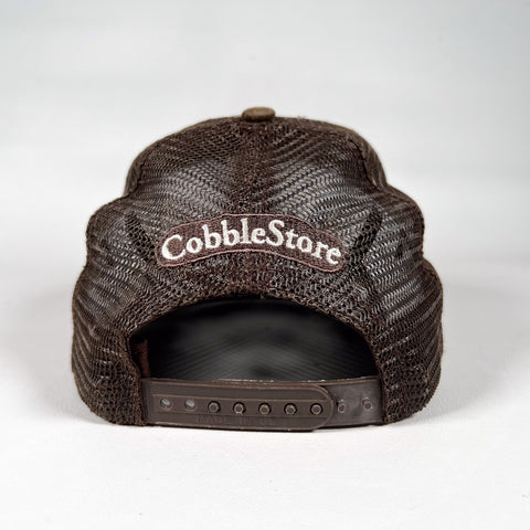 A classic camo Richmond trucker hat featuring crisp white gothic embroidery across the front and matching CobbleStore embroidery on the back. Structured camo front panels, breathable brown mesh sides and back, and an adjustable snapback closure. Made in the USA on an authentic vintage trucker blank.