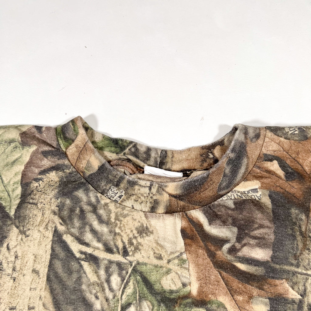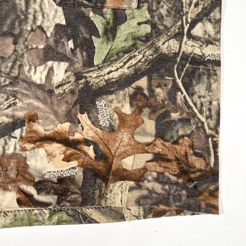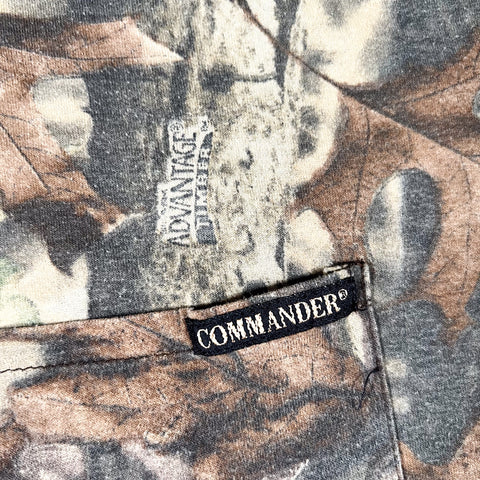 Authentic vintage 1990s camouflage pocket tee featuring classic AdvantEdge woodland camo with detailed bark, branch, and leaf patterning throughout. Finished with a chest pocket accented by the original Commander® woven tag, a great detail that ties this piece firmly to late-90s outdoor and huntingwear.