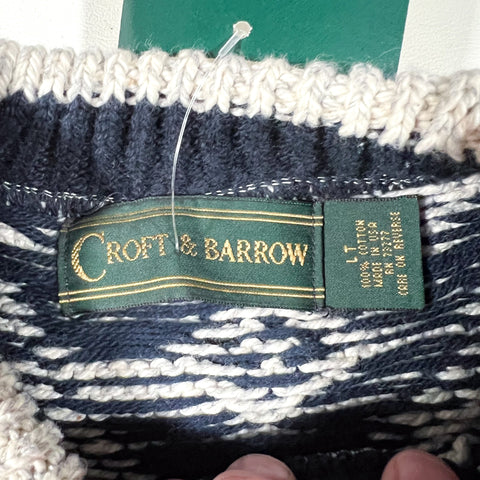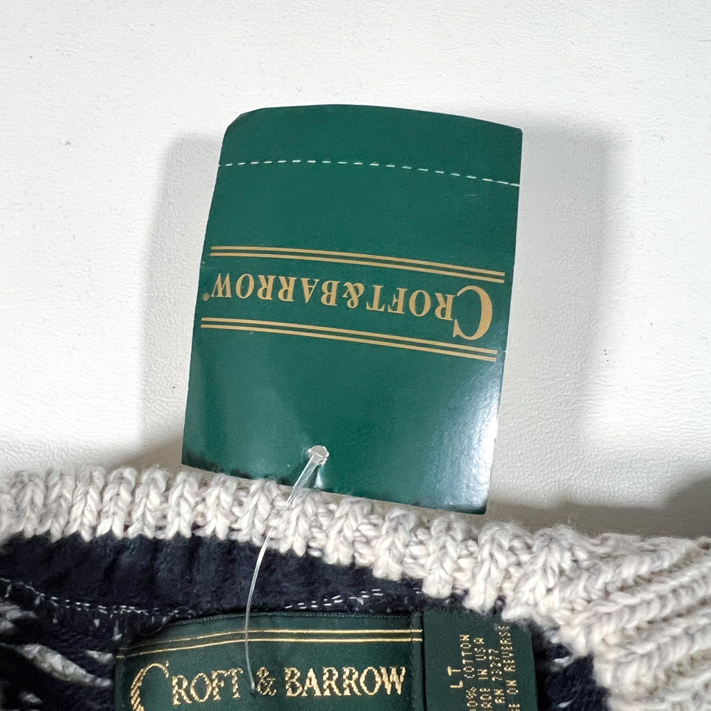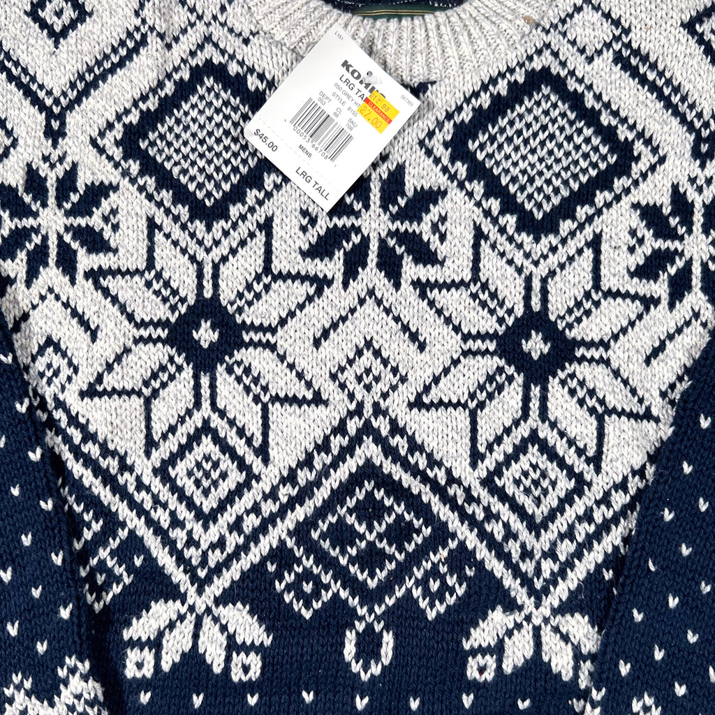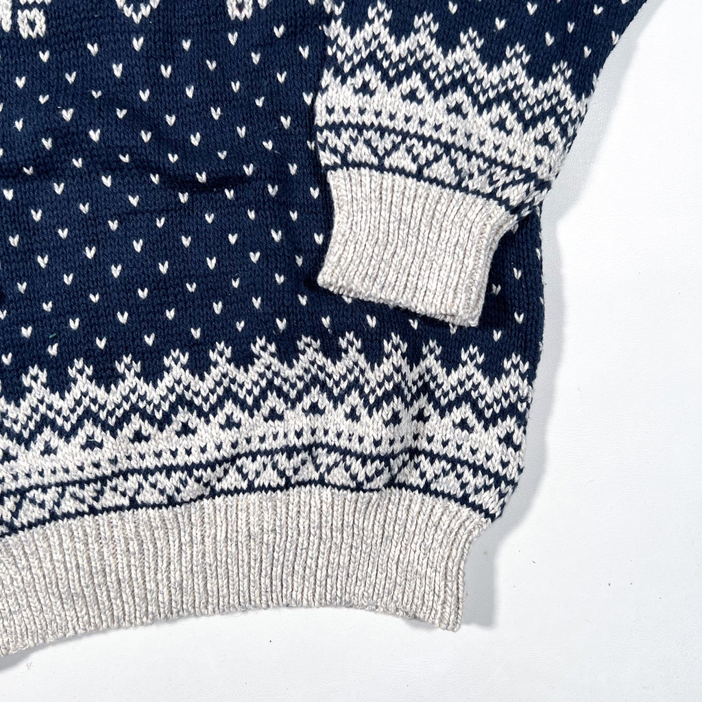 Classic vintage 90's Croft & Barrow snowflake knit sweater featuring a bold Nordic-inspired pattern across the chest and sleeves. Deep navy base with crisp cream detailing, ribbed cuffs and hem, and that signature 90’s cozy feel. This one still has its original hangtag attached — a fun time-capsule detail.