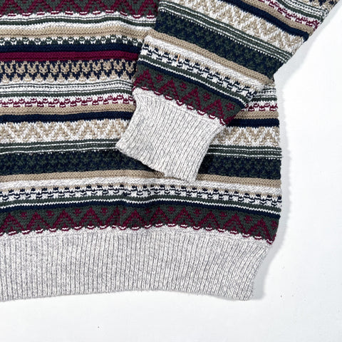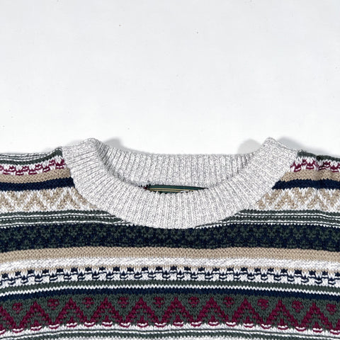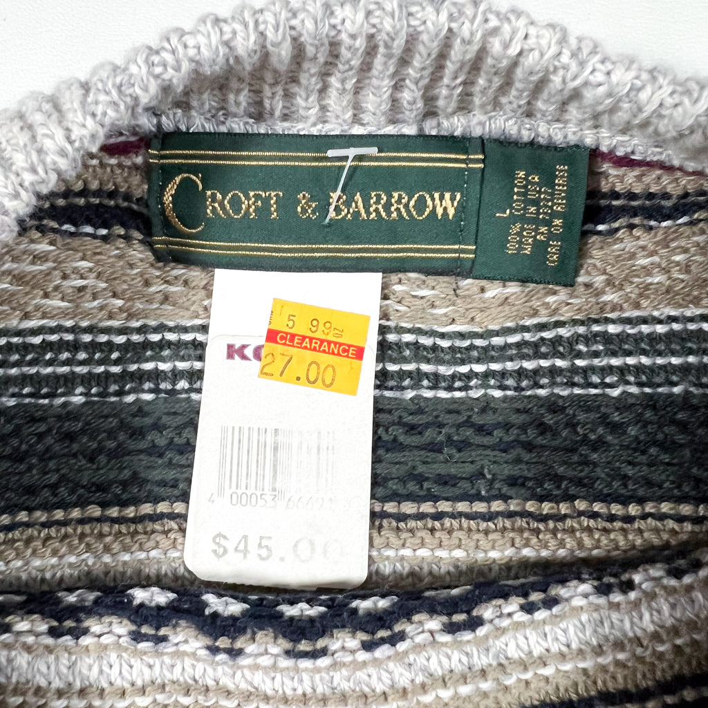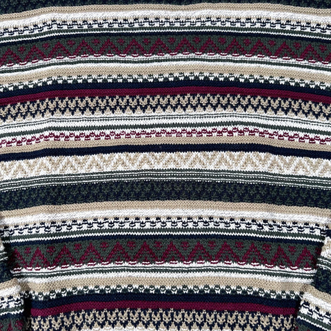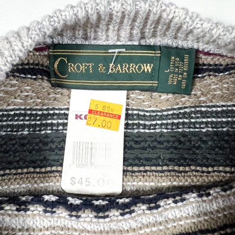 Fantastic vintage 90's Croft & Barrow knit sweater featuring a multi-color textured stripe pattern with deep green, maroon, tan, and cream tones. Soft cotton knit with ribbed cuffs, hem, and neckline. Classic cozy 90's look with a relaxed, slightly oversized fit.