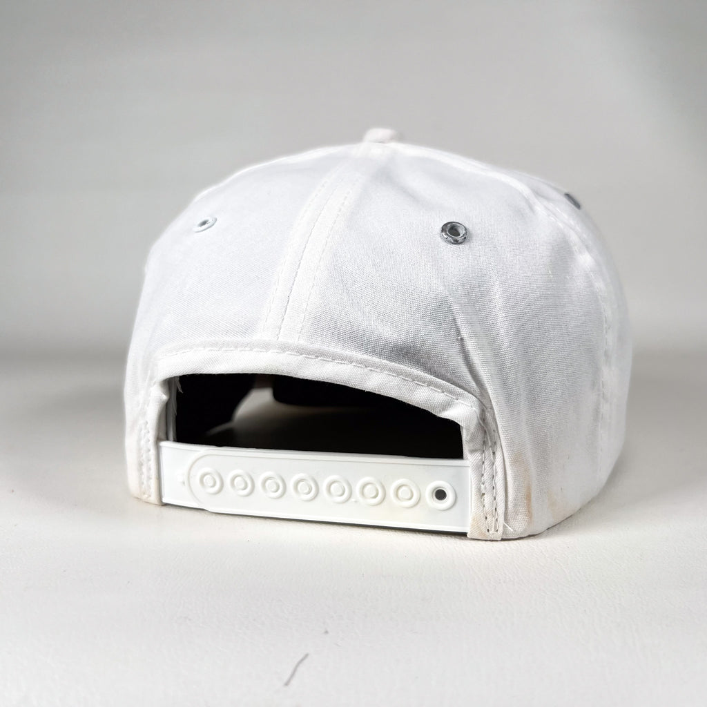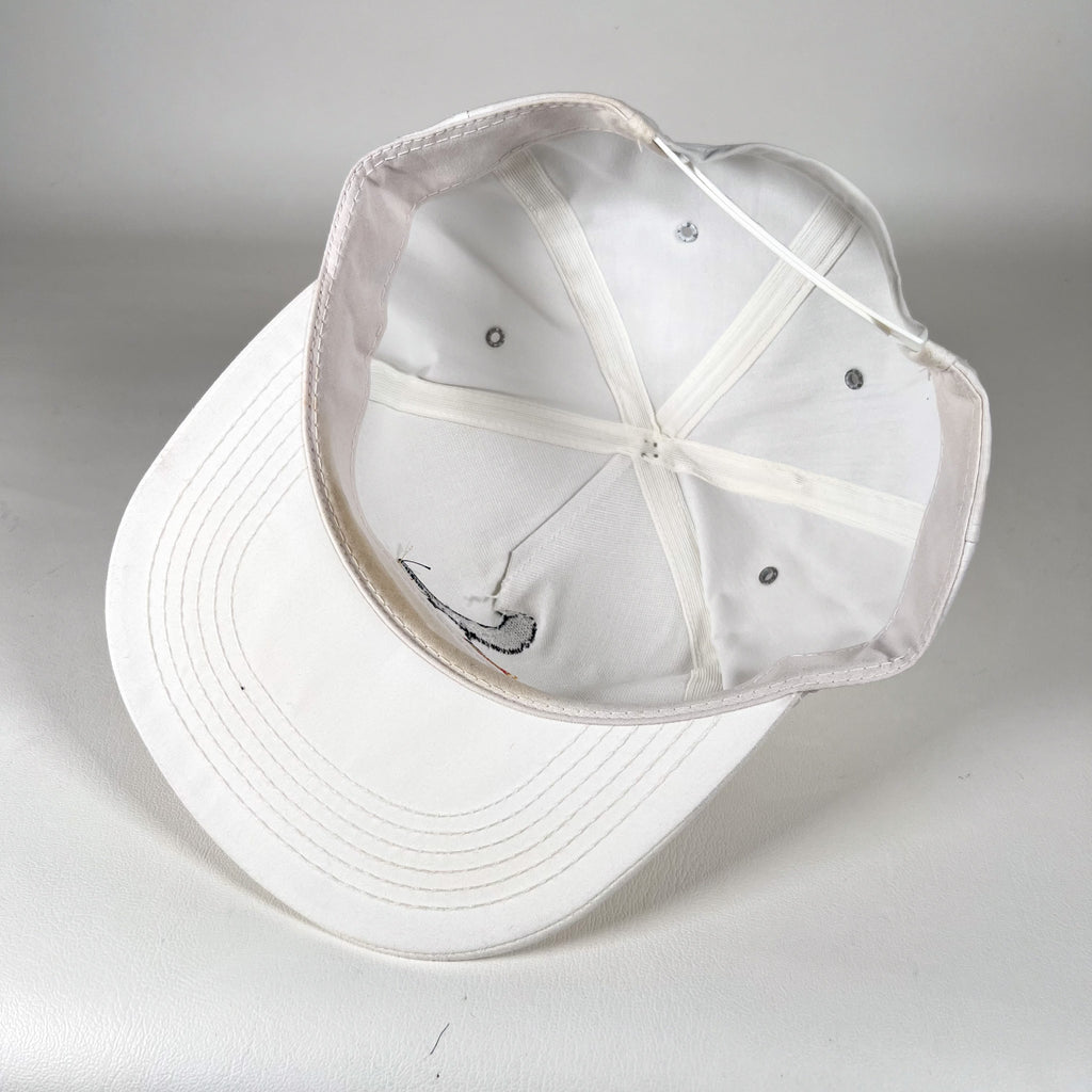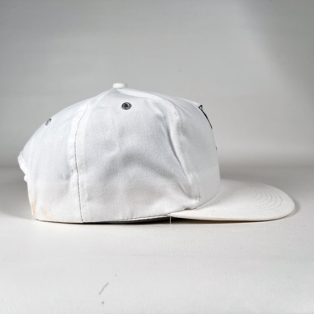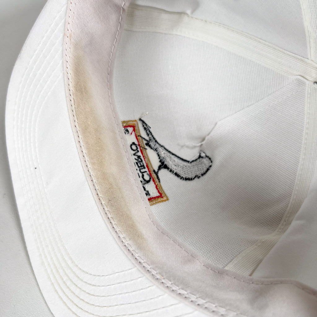 Classic vintage Cuervo Tradicional snapback featuring the iconic black crow embroidery above the Cuervo Tradicional front patch. Clean white crown and brim with a structured fit and adjustable snapback closure. A strong piece of vintage liquor and tequila memorabilia with a timeless, minimal graphic.