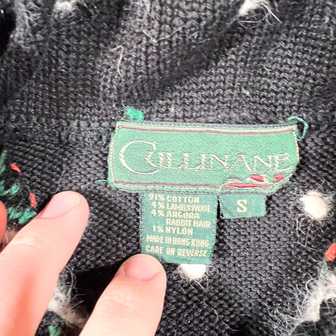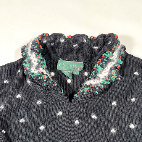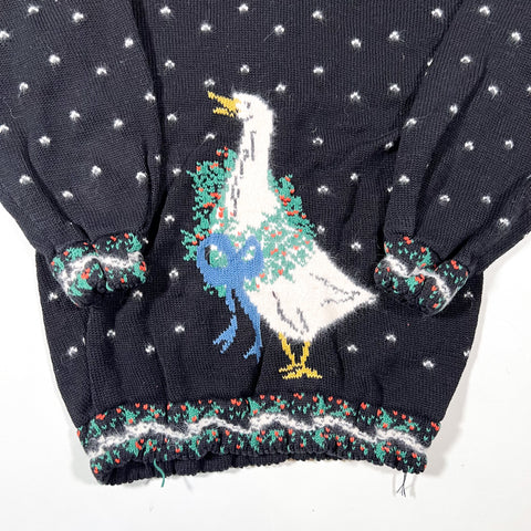 Perfect vintage 90’s holiday energy — a cozy navy knit sweater featuring a festive goose proudly rocking a wreath and bow. Polka-dot knit pattern throughout with colorful trim at the collar, cuffs, and hem. Soft wool–angora blend gives it that classic 90’s fuzzy holiday sweater feel. Made in Hong Kong.