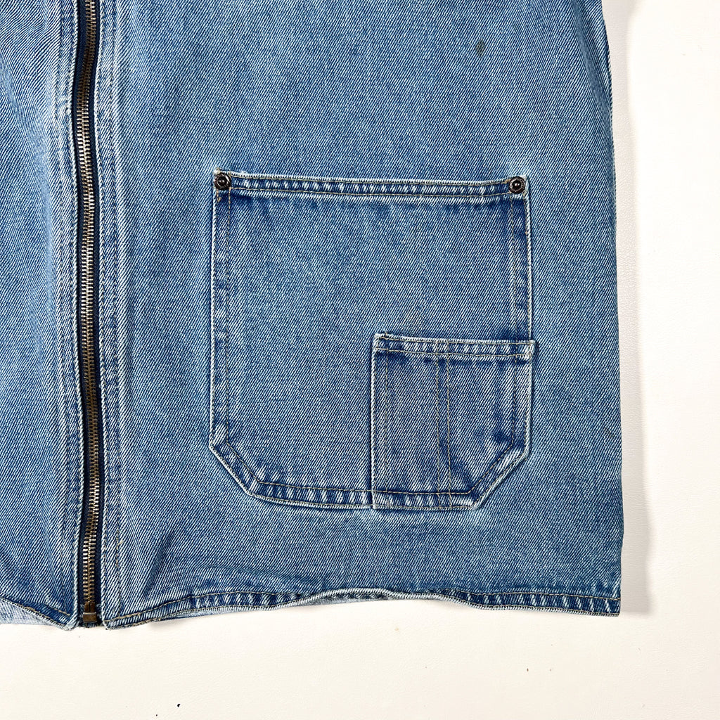 Classic 1990s light-wash denim utility vest with a full zip front and four front patch pockets, including one button-flap pocket for extra storage. Perfect for layering, workwear styling, or as a standout piece in a vintage fit. Nice medium-light wash with subtle fading consistent with age.