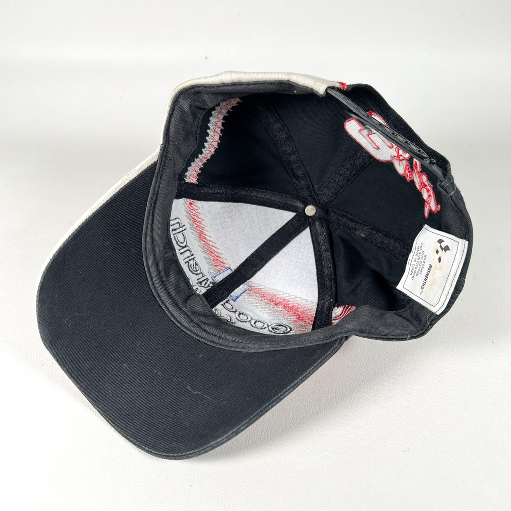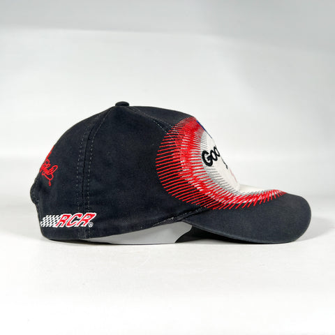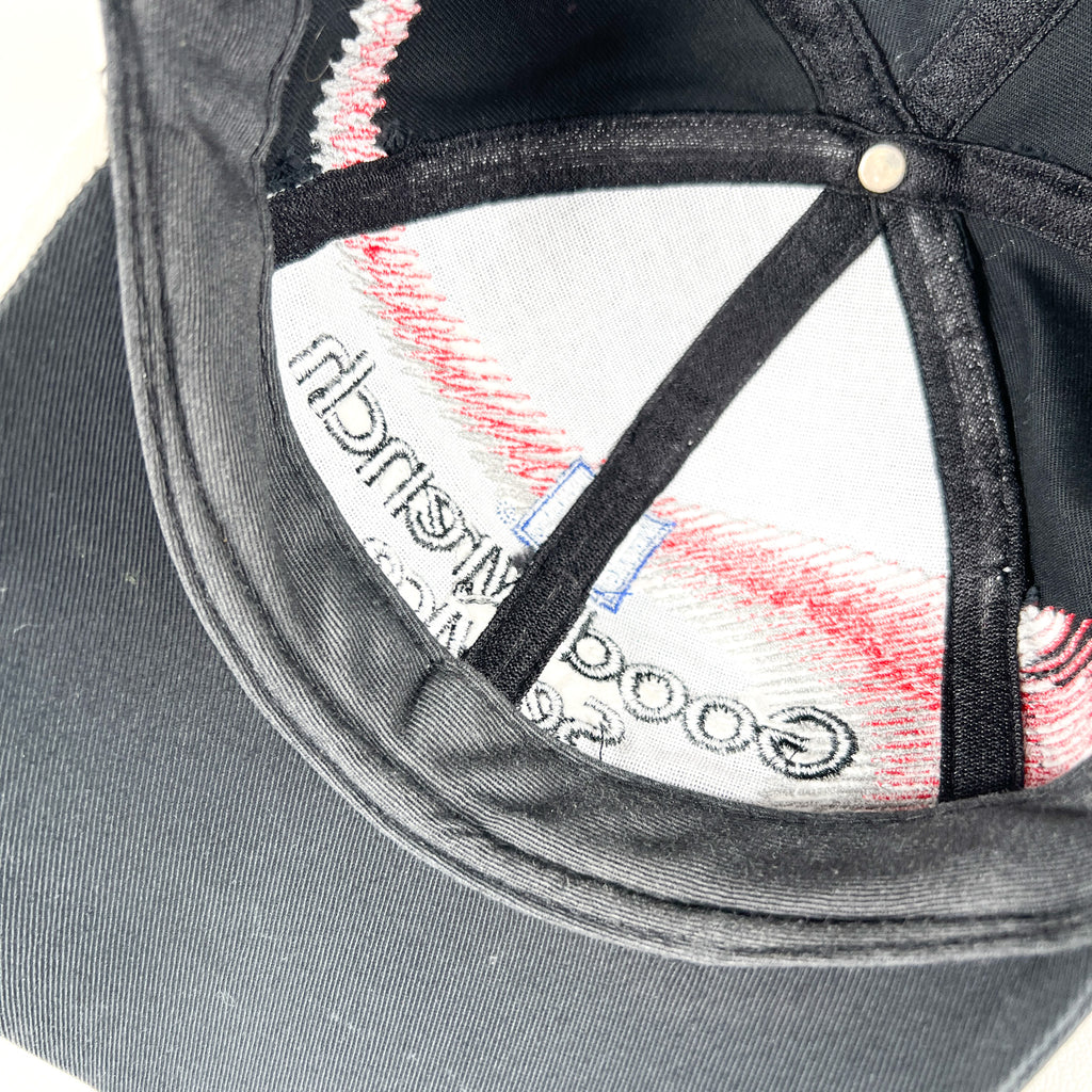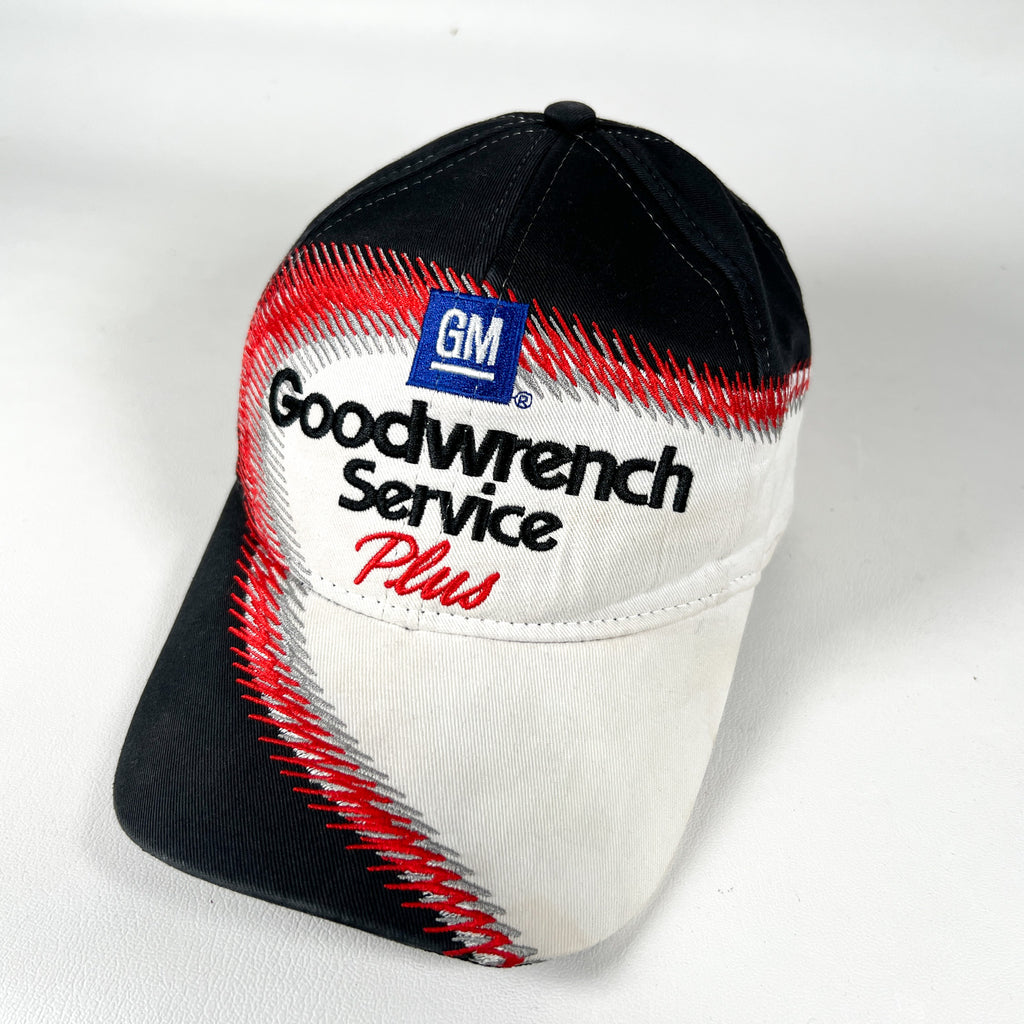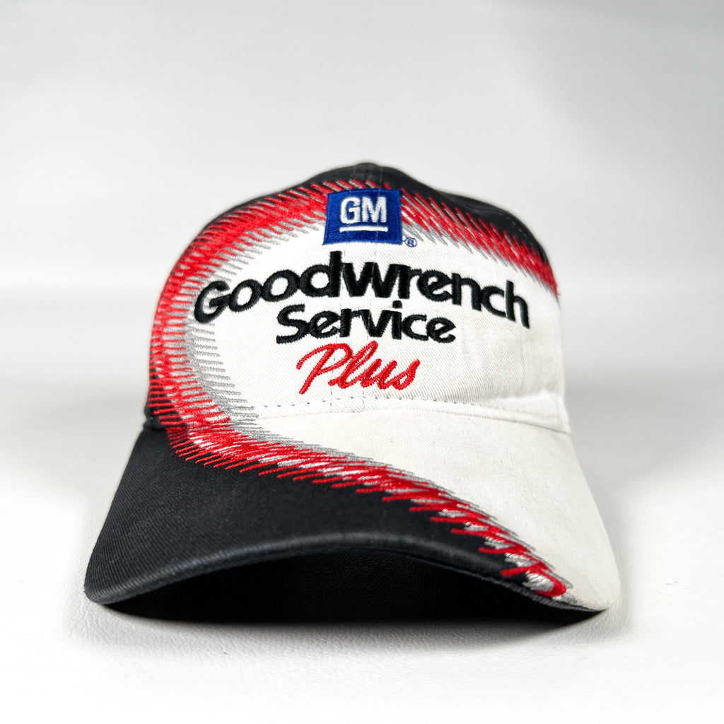 Vintage Dale Earnhardt #3 NASCAR snapback hat featuring bold embroidered GM Goodwrench Service Plus graphics across the front panel. The crown displays the GM logo above the Goodwrench branding with red and silver stitched racing accents that continue across the brim and side panels.