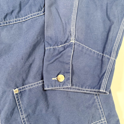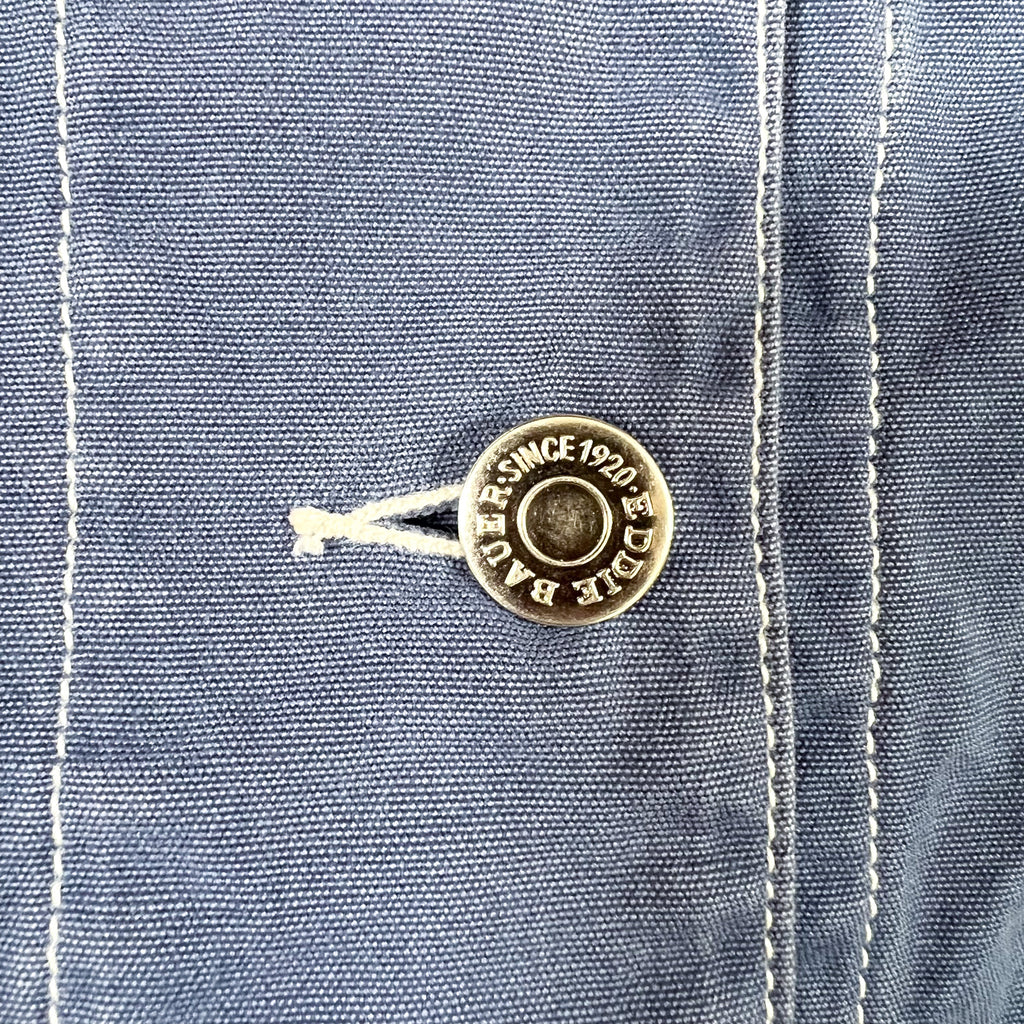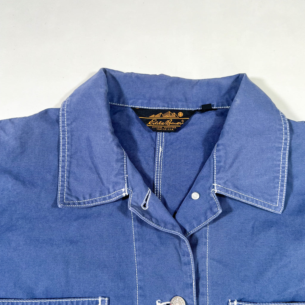 Vintage 90’s Eddie Bauer indigo chore jacket featuring heavy white contrast stitching, classic utility pockets, and branded metal hardware. Made in the USA with a sturdy mid-weight cotton that breaks in beautifully. Button-front closure with Eddie Bauer engraved snaps and a traditional workwear silhouette.