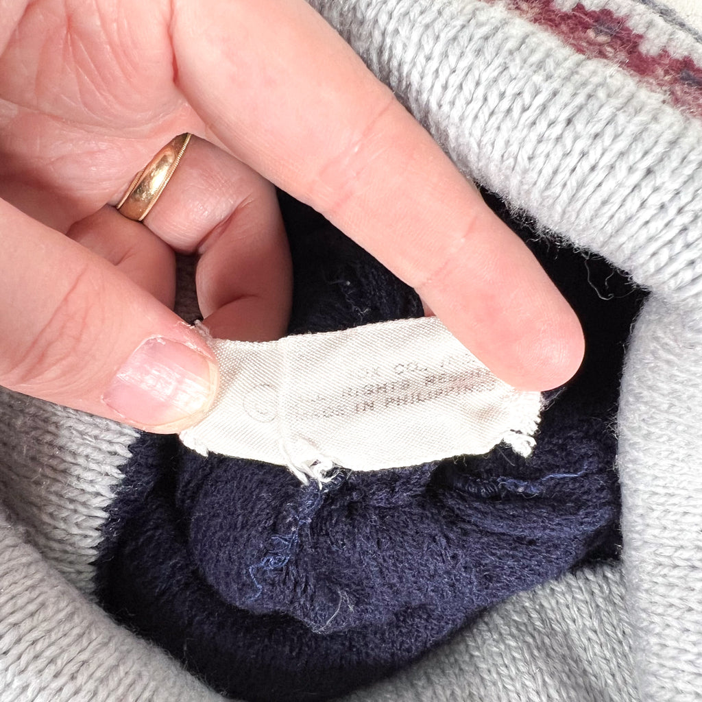Cozy vintage 90's knit winter hat featuring a classic Fair Isle pattern in navy, tan, green, burgundy, and soft ice-blue. The foldover cuff adds extra warmth and showcases a contrasting burgundy geometric band. Fully lined in a deep navy knit for added insulation and comfort.