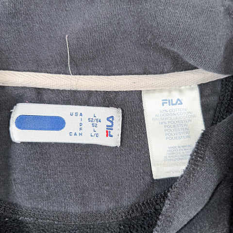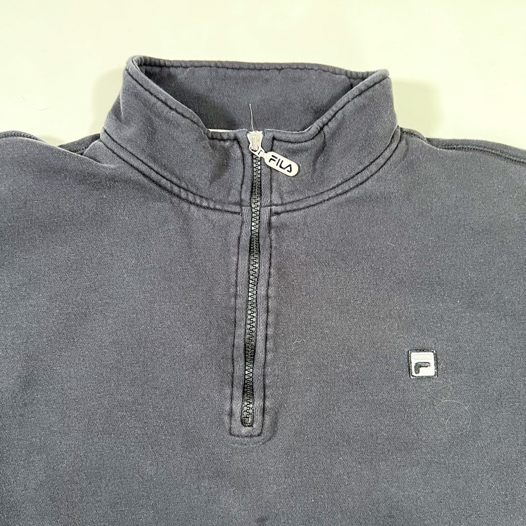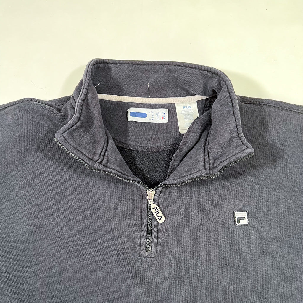 Classic vintage 90’s FILA 1/4 zip sweatshirt in a deep charcoal/black tone. Features the raised FILA “L” chest logo, branded zipper pull, and heavyweight cotton-blend fleece interior. Clean, minimal, and perfectly oversized with that unmistakable 90’s athleticwear fit.