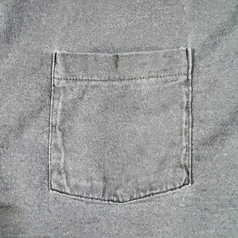 Vintage 1990s black pocket tee on classic Fruit of the Loom tag with a soft, broken-in feel and true workwear-style fit. Features a single chest pocket, washed charcoal-black color, and natural age fade throughout.