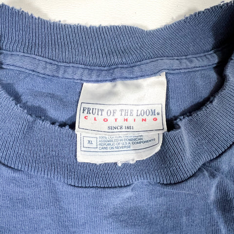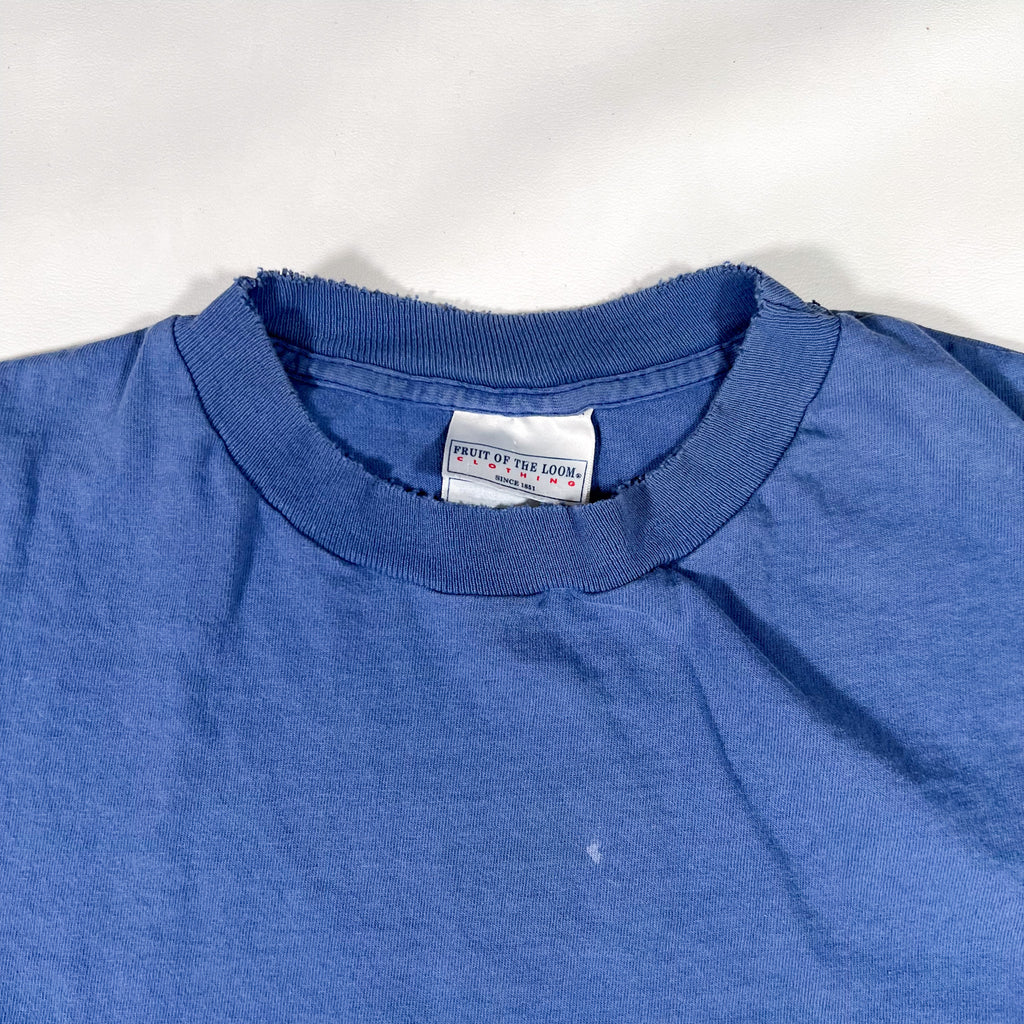 Vintage 1990s blue blank tee on classic Fruit of the Loom tag with a soft, worn-in feel and natural fading from age. Perfect staple piece for everyday wear, screen printing, layering, or that true vintage basics look. Slightly longer fit with relaxed drape.
