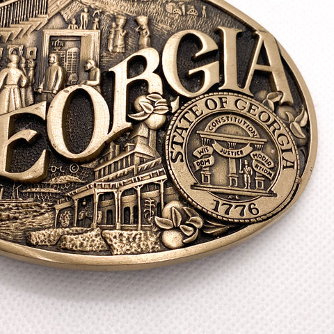 Vintage solid brass belt buckle featuring an intricate “Georgia” design with detailed scenes of the state’s history and culture. The centerpiece includes the official State of Georgia seal (1776) alongside raised “GEORGIA” lettering, surrounded by finely cast imagery including architecture, figures, and regional elements.