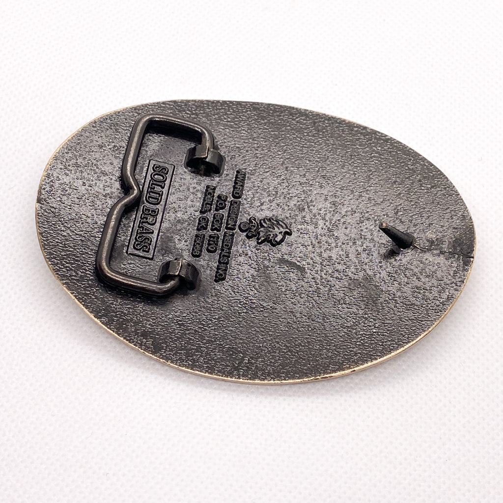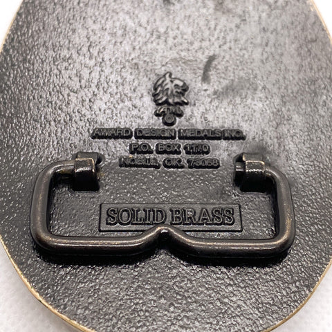 Made by Award Design Medals Inc. (Oklahoma), as marked on the back, and constructed from solid brass with a darkened, aged finish that highlights the depth of the design.