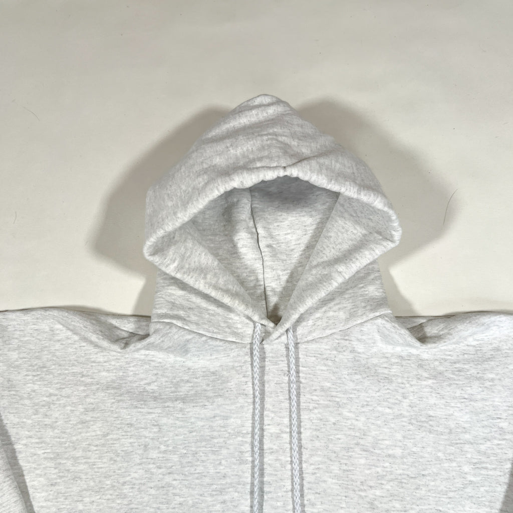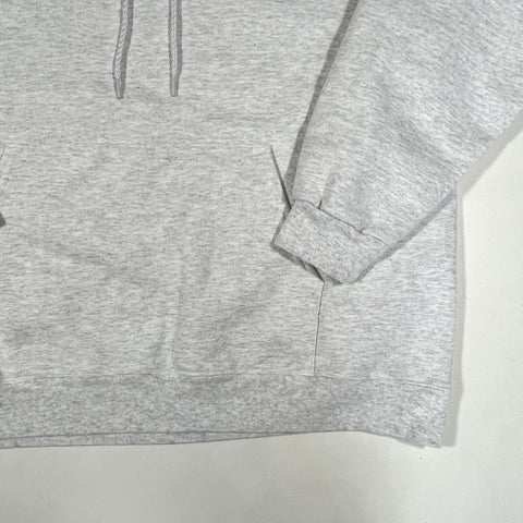 Classic 1990s Hanes Ultimate Cotton pullover hoodie in a clean heather gray. Made from a soft but substantial cotton fleece with a cozy brushed interior, featuring a drawstring hood, front kangaroo pocket, and ribbed cuffs and hem. A staple 90s blank hoodie with an easy, timeless look that works for everyday wear, layering, or casual streetwear.
