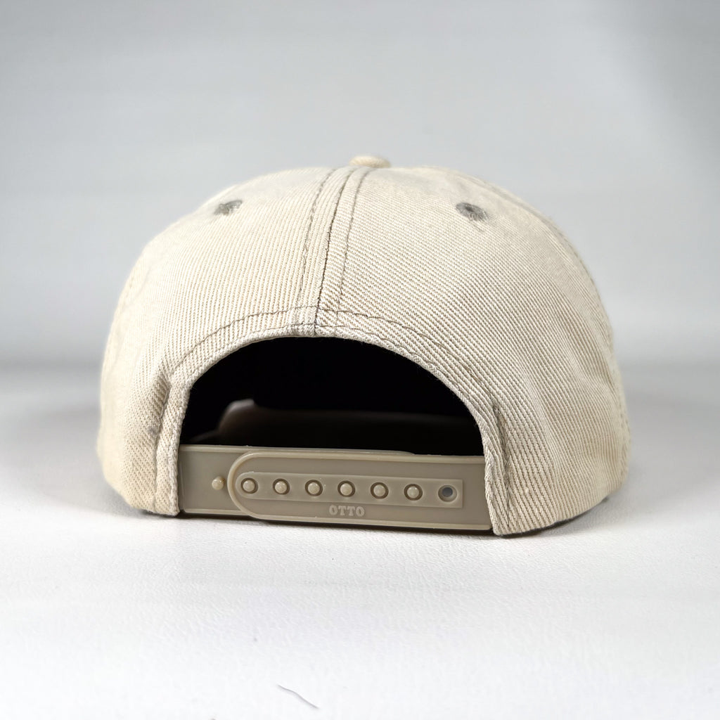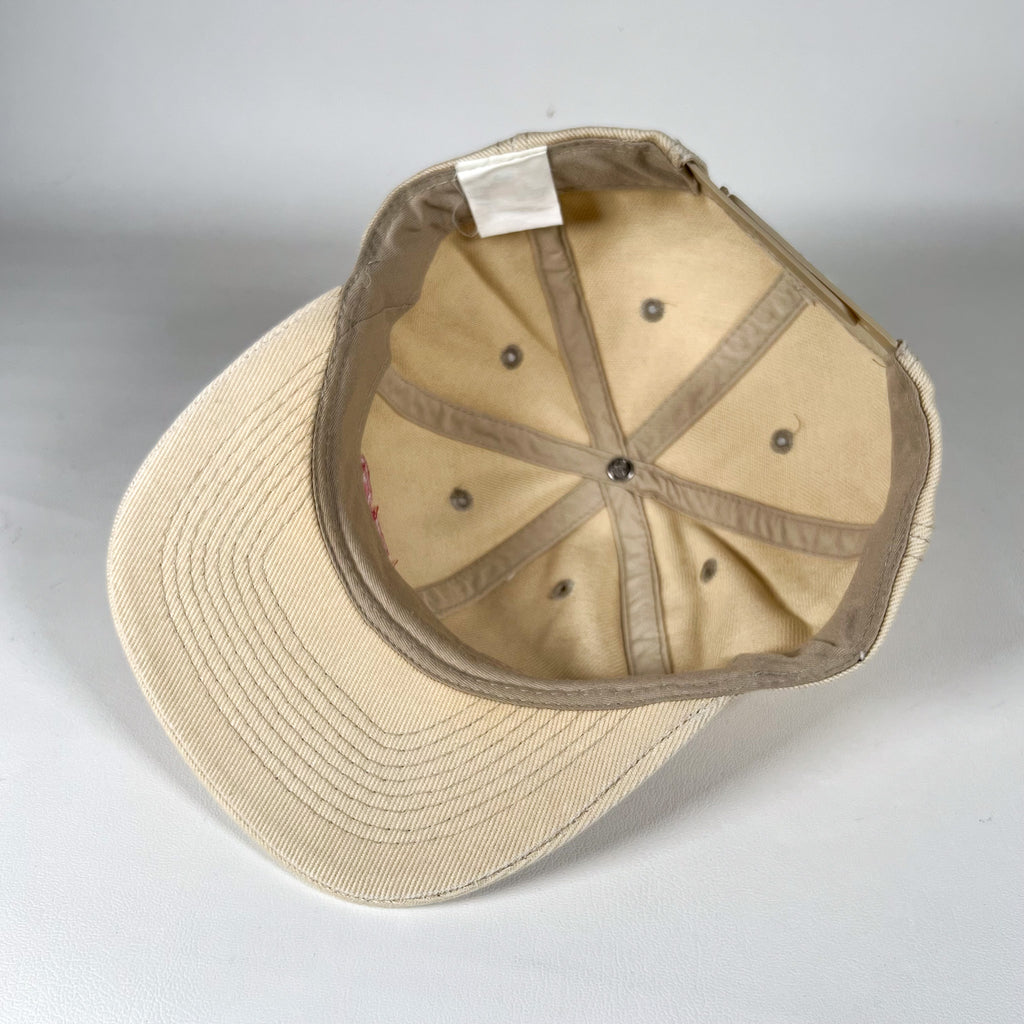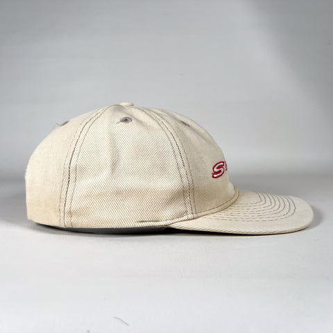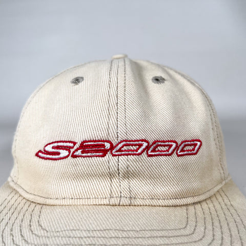 Vintage 1990s Honda S2000 snapback hat featuring a red embroidered “S2000” logo on a cream cotton twill body. Classic low-profile fit with a structured crown and flat brim. Adjustable snapback closure with OTTO branding on the strap. A clean, understated automotive piece tied to one of Honda’s most iconic sports cars.