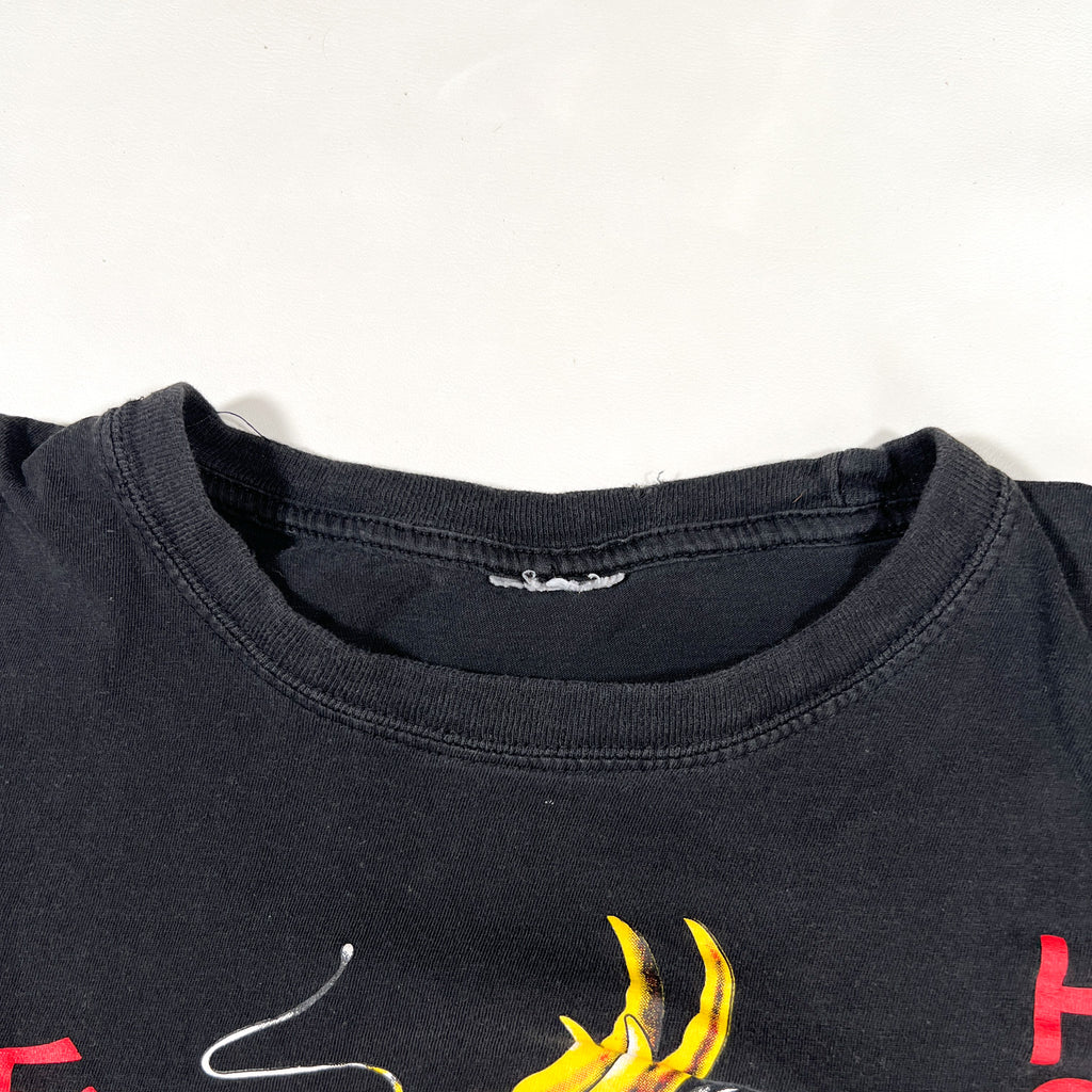 Good vintage condition with light fading to the black fabric and minor cracking to the graphic consistent with age. No major holes or stains noted. Small wear at the neck tag area where the tag was removed (shown in photos).