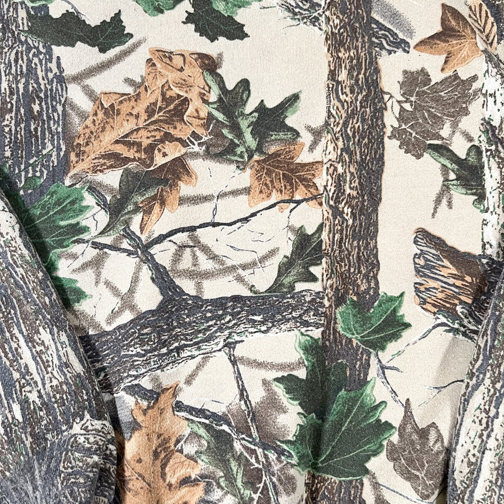 Classic 90’s Jerzees Outdoors camo sweatshirt with a full allover woodland print featuring rich greens, browns, and textured bark detailing. Made in the USA and built from that unmistakable vintage fleece — soft, thick, and perfectly worn-in. Tagged L but fits more like a modern Medium.