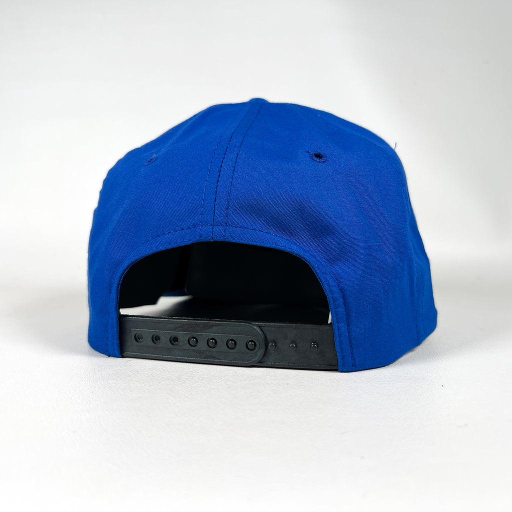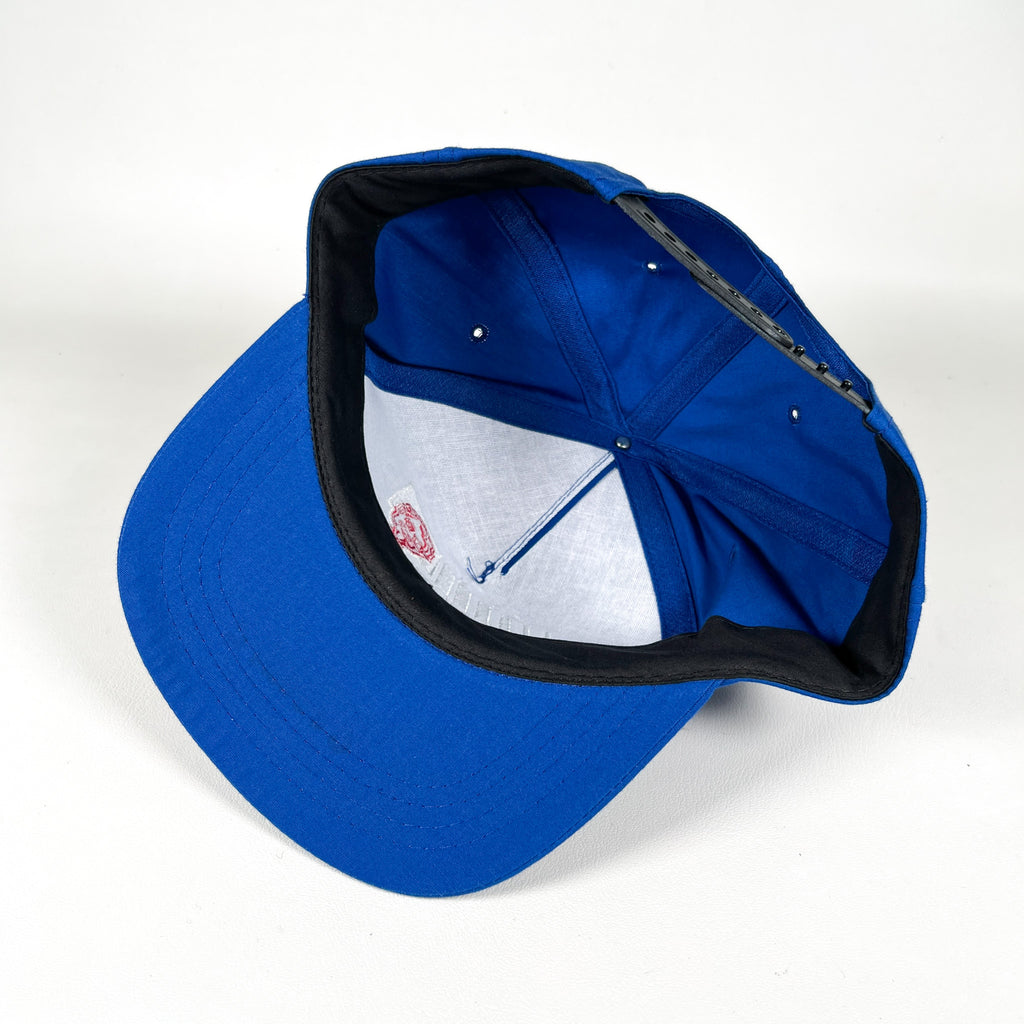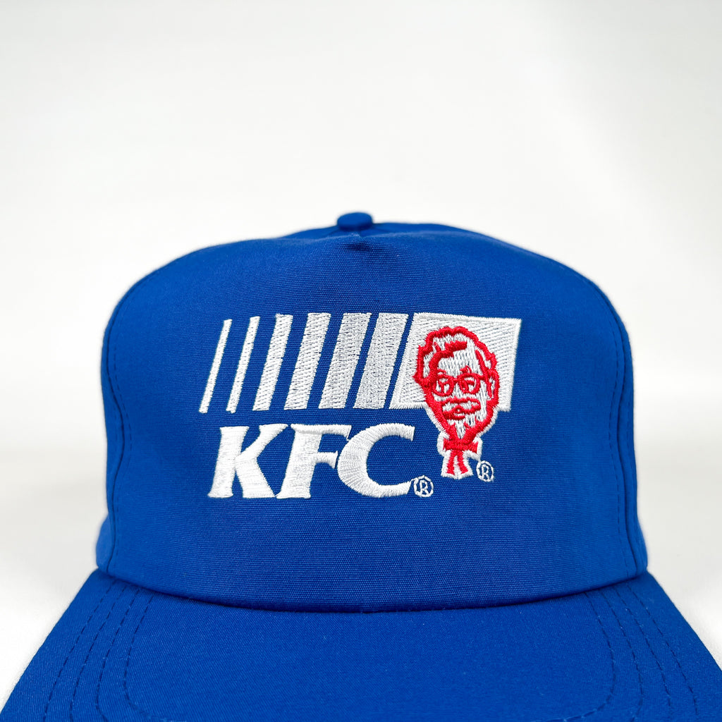Rare vintage 1990s KFC promotional snapback hat in a bold royal blue. Features the embroidered KFC logo with Colonel Sanders graphic across the front. Classic structured crown with a black plastic snapback closure for an adjustable fit.