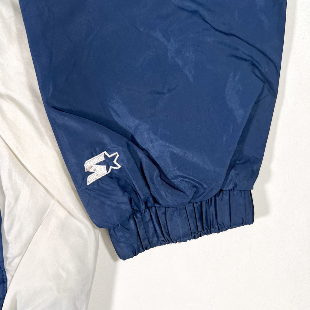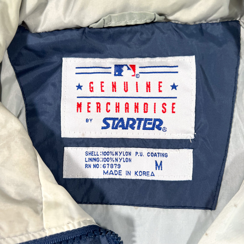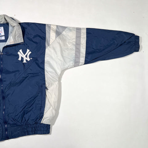 Classic 90’s Yankees Starter full-zip windbreaker in navy and light grey with bold embroidered hits on the chest and back. Features elastic cuffs and hem, lightweight nylon shell, angled color-blocked panels, and the iconic Starter star logo on the sleeve. Perfect everyday fanwear with that true 90’s athletic fit.