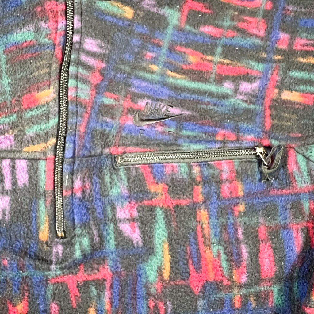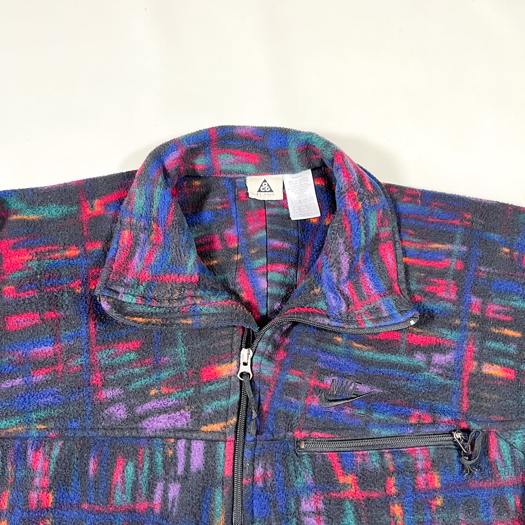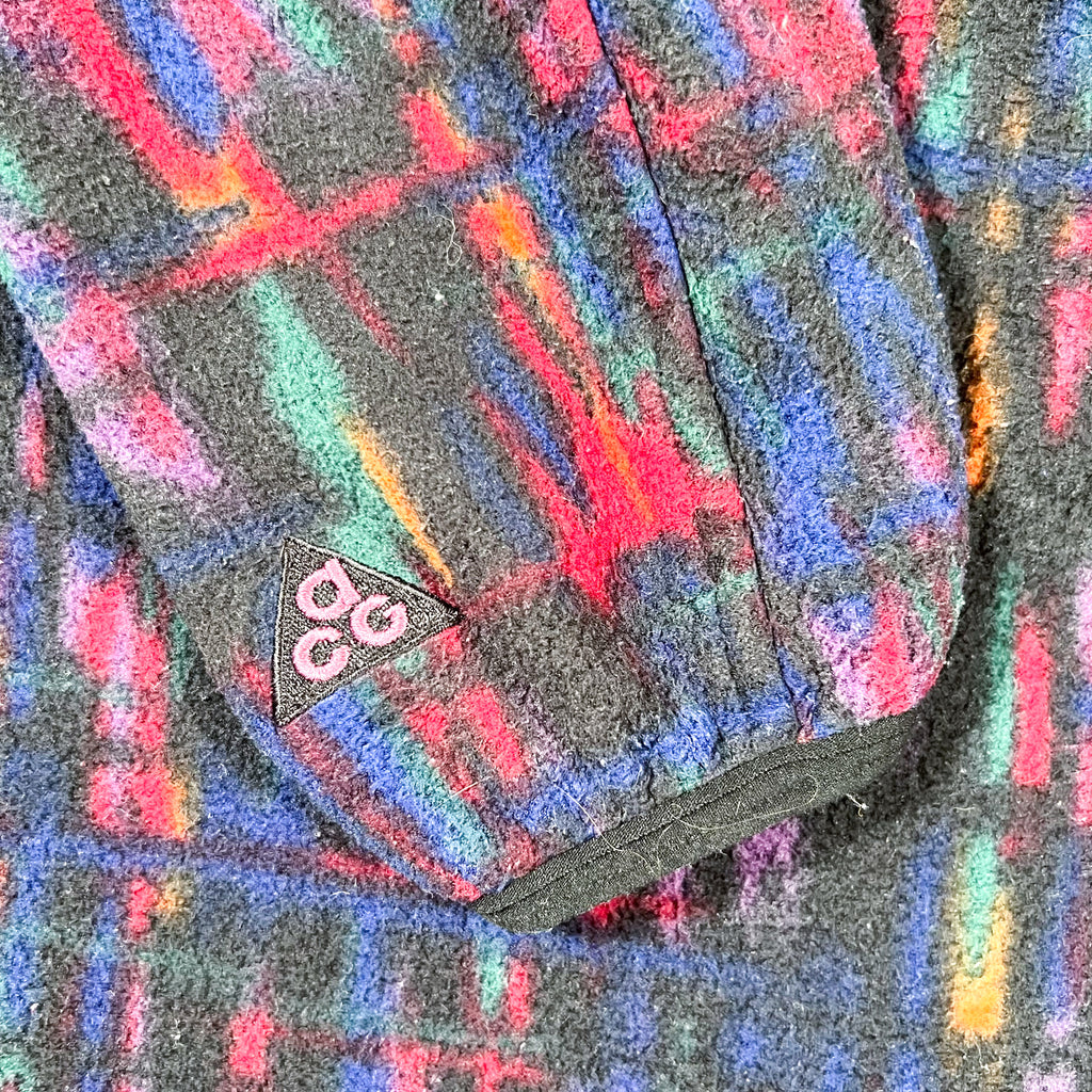 This is a vintage 1990s Nike ACG fleece jacket featuring one of the wildest all-over abstract prints Nike ever made. Classic 90s ACG colors — neon red, teal, purple, cobalt blue — over a charcoal base.