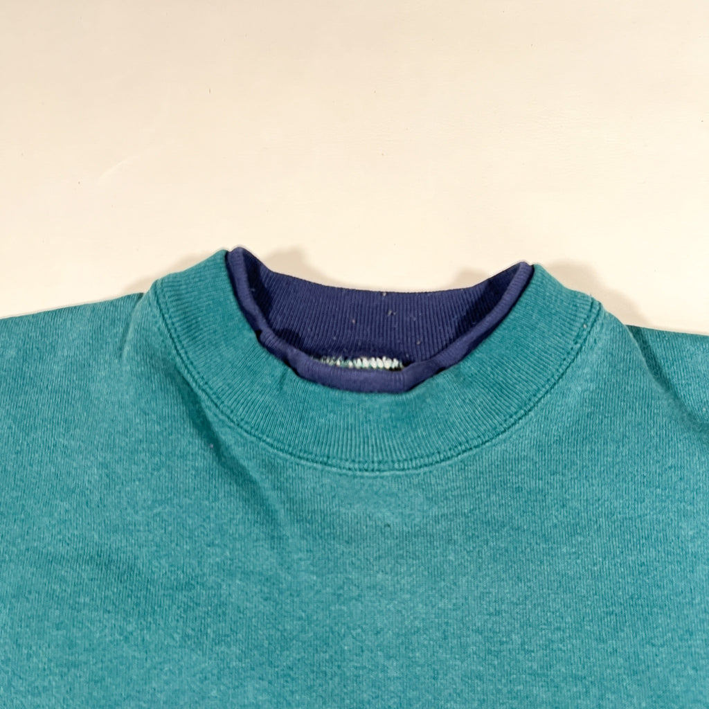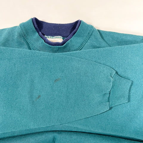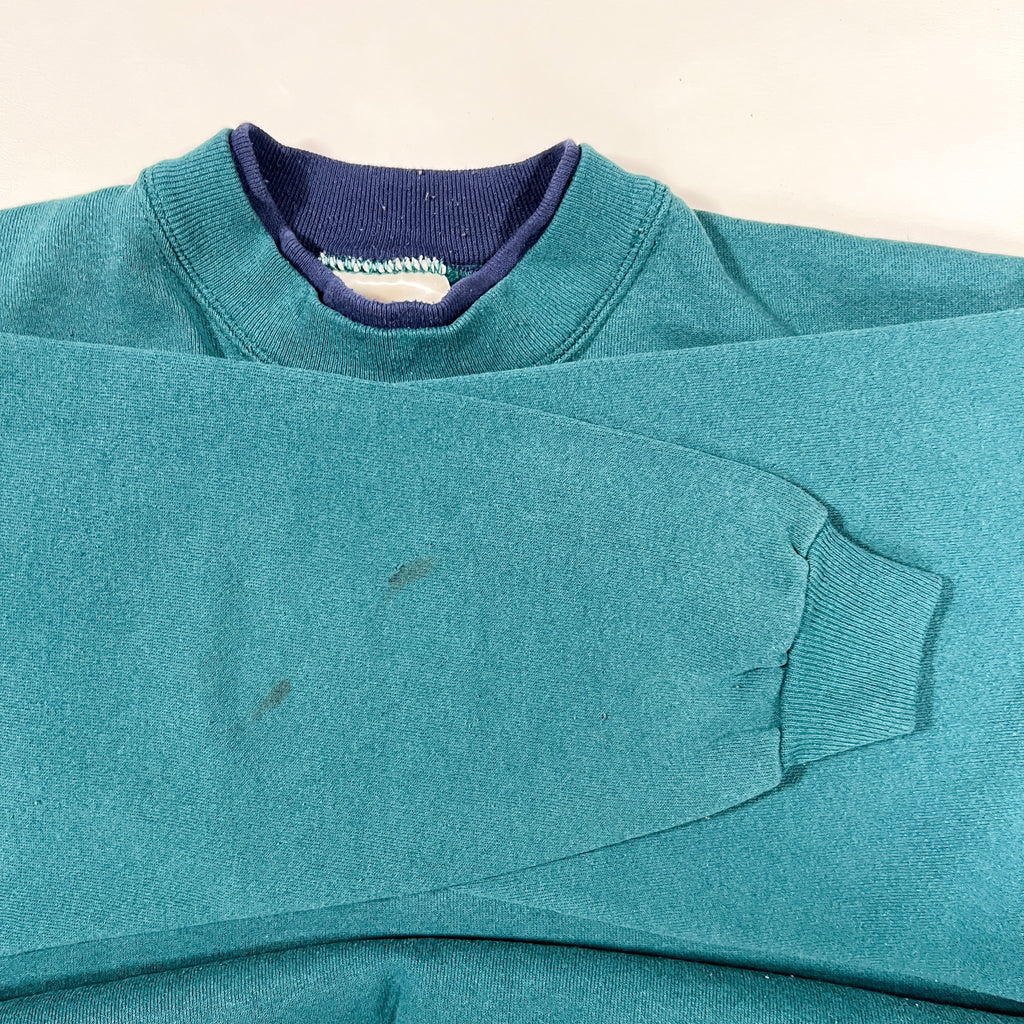 Clean and classic 1990s teal crewneck sweatshirt with a simple, timeless look and nice boxy vintage fit. Solid color makes this an easy everyday layer that works with just about anything. Soft fleece interior with ribbed collar, cuffs, and hem. Great staple piece if you’re into minimal vintage or want something that pairs well with denim, cargos, or workwear.