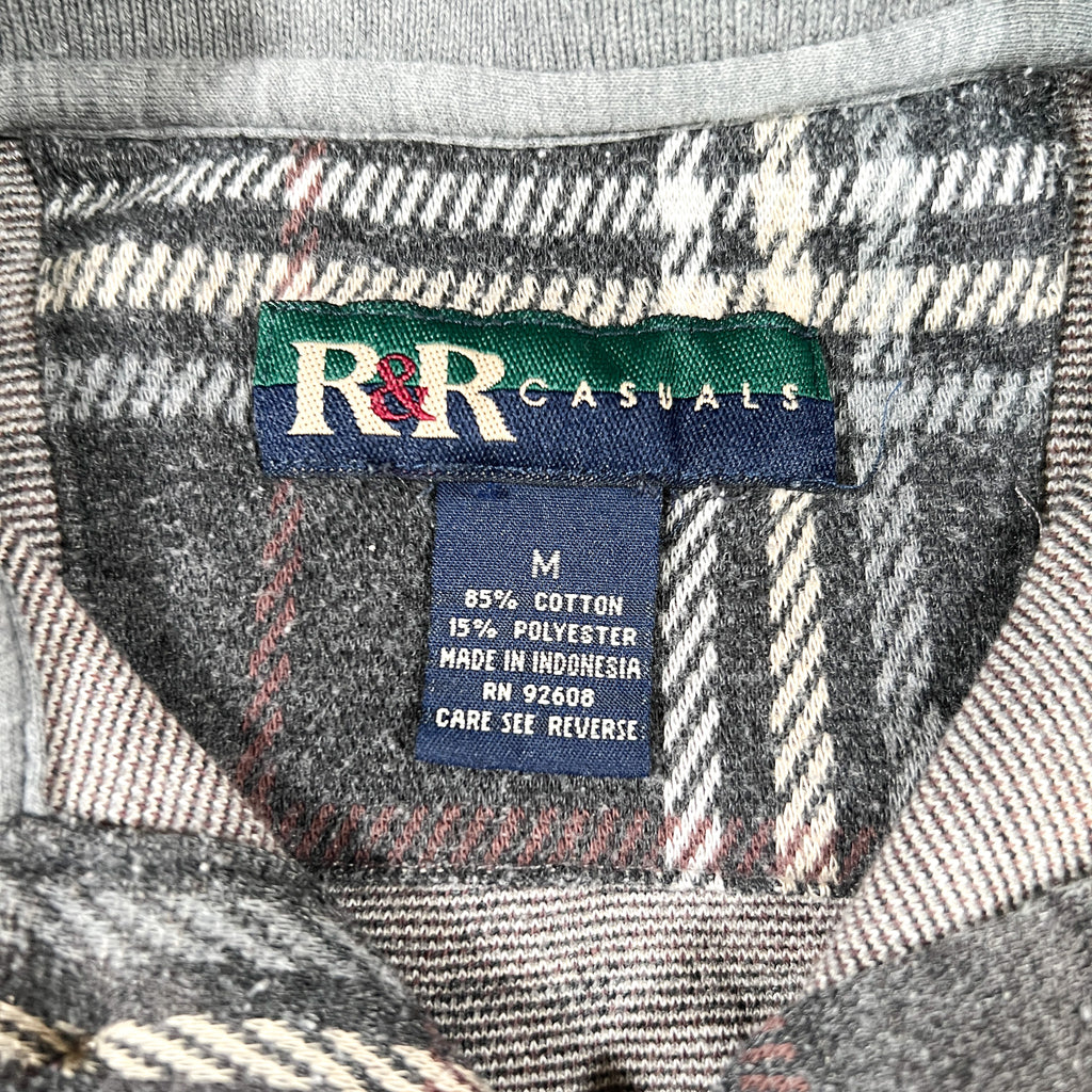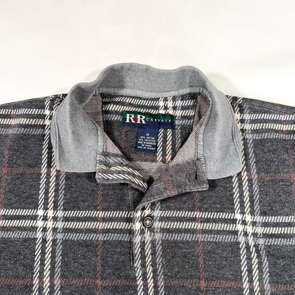 Authentic vintage 1990s R&R Casuals long sleeve plaid pullover shirt featuring a charcoal grey base with cream and subtle red windowpane striping. Designed with a soft ribbed collar and cuffs, partial button placket, and cozy brushed fabric that wears like a lightweight flannel or rugby-style top. This is a classic 90s casual layer with understated grunge/prep crossover appeal.