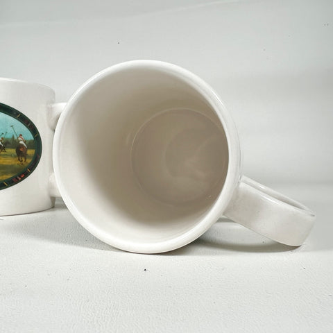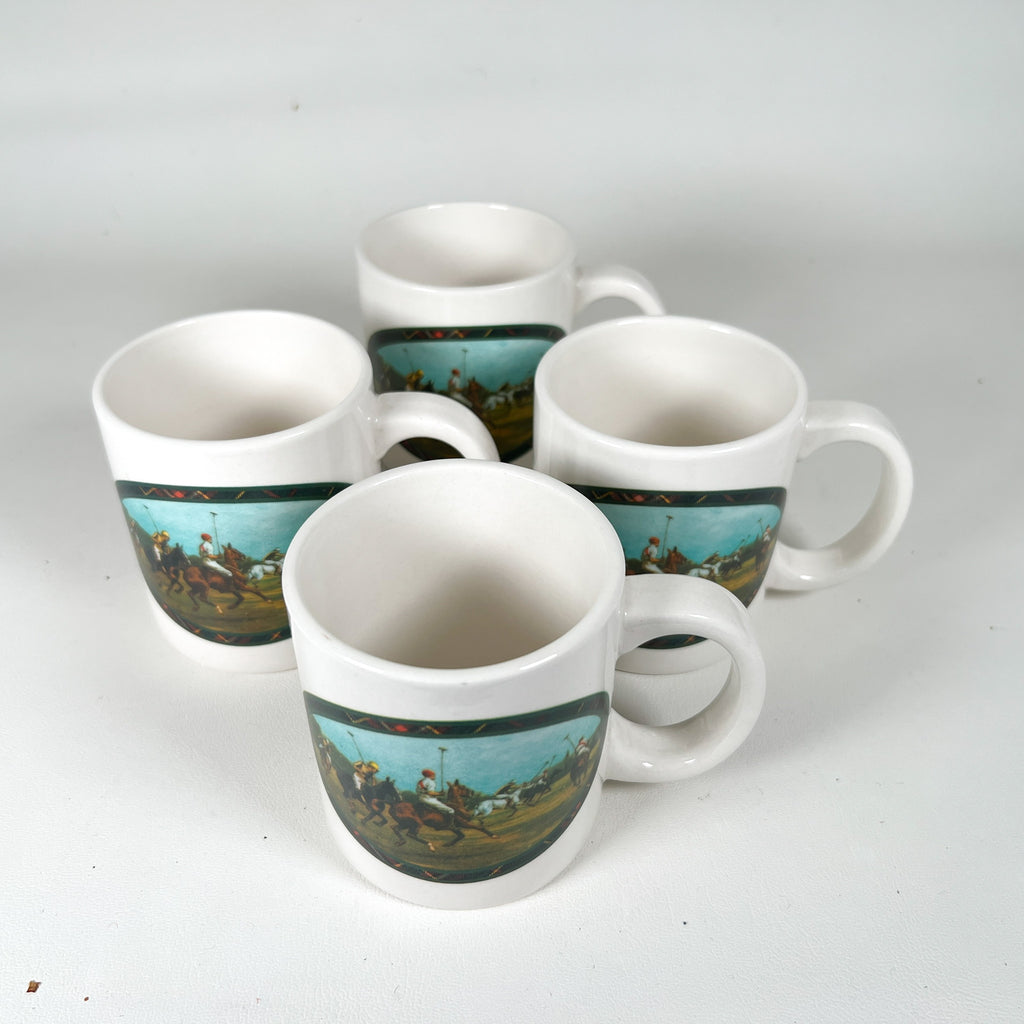 Set of four vintage Ralph Lauren ceramic mugs featuring a classic polo match scene. Each mug displays detailed equestrian artwork framed with a subtle patterned border, reflecting the brand’s signature style and heritage.