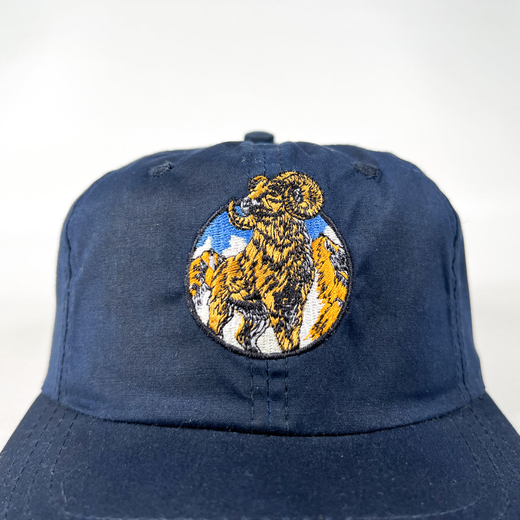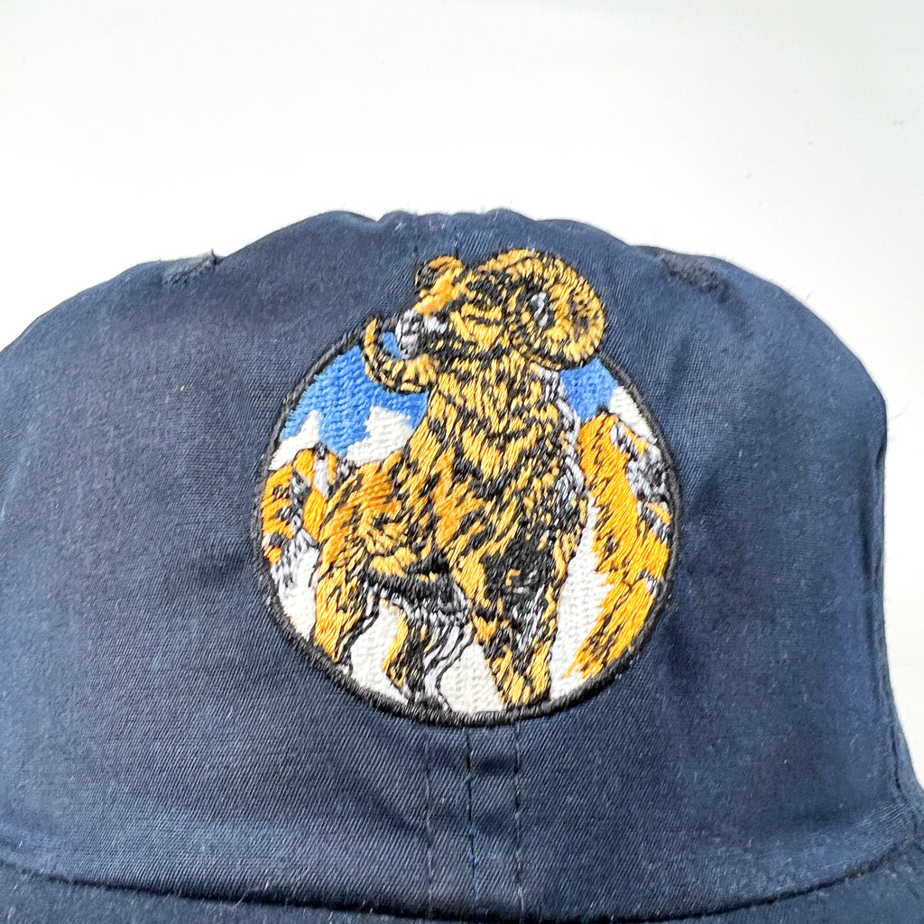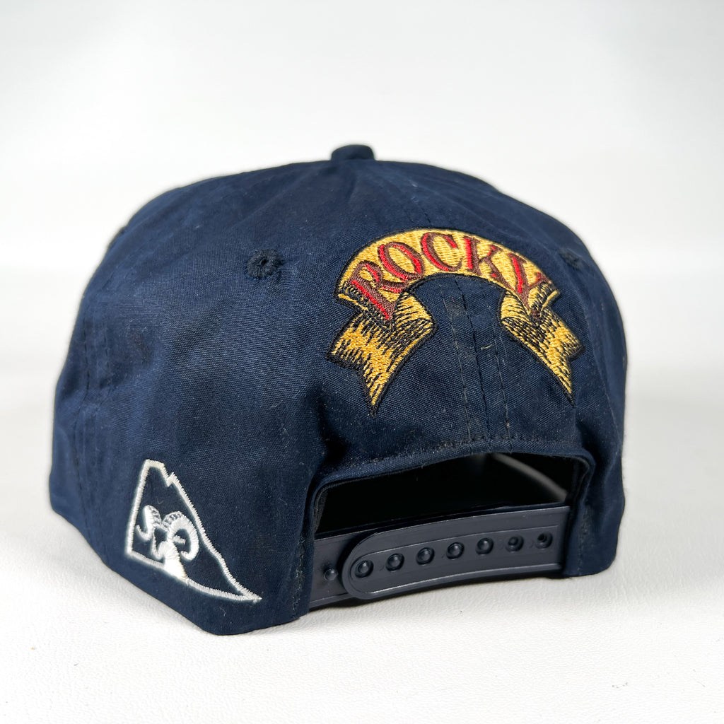 Rare vintage 90’s Rocky Shoes & Boots sample hat featuring a bold embroidered ram logo set against a mountain backdrop on the front. The back showcases “ROCKY” in arched embroidery, with an additional ram graphic hit on the rear side panel—giving this piece strong outdoor/workwear branding appeal.