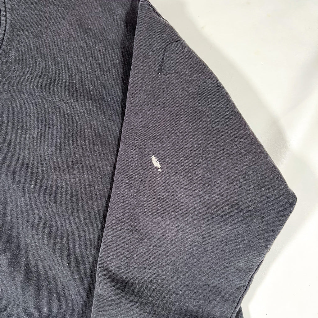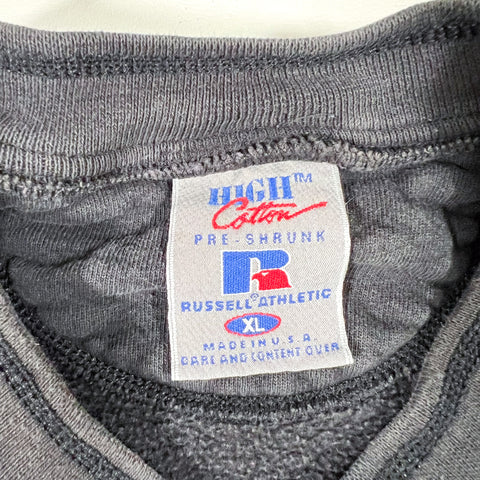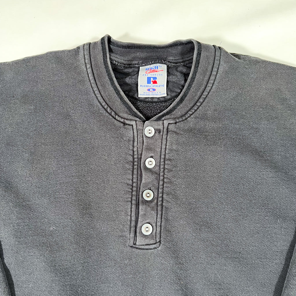 Authentic 90’s Russell Athletic High Cotton heavyweight henley-style sweatshirt in a washed black/charcoal tone. Made in USA. Four-button placket, ribbed cuffs, and true vintage feel with soft interior fleece. Casual, comfortable, and classic Russell workwear-athletic styling.