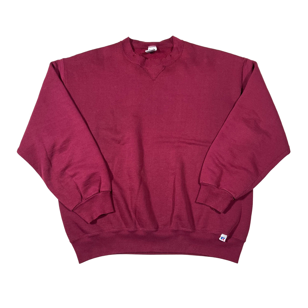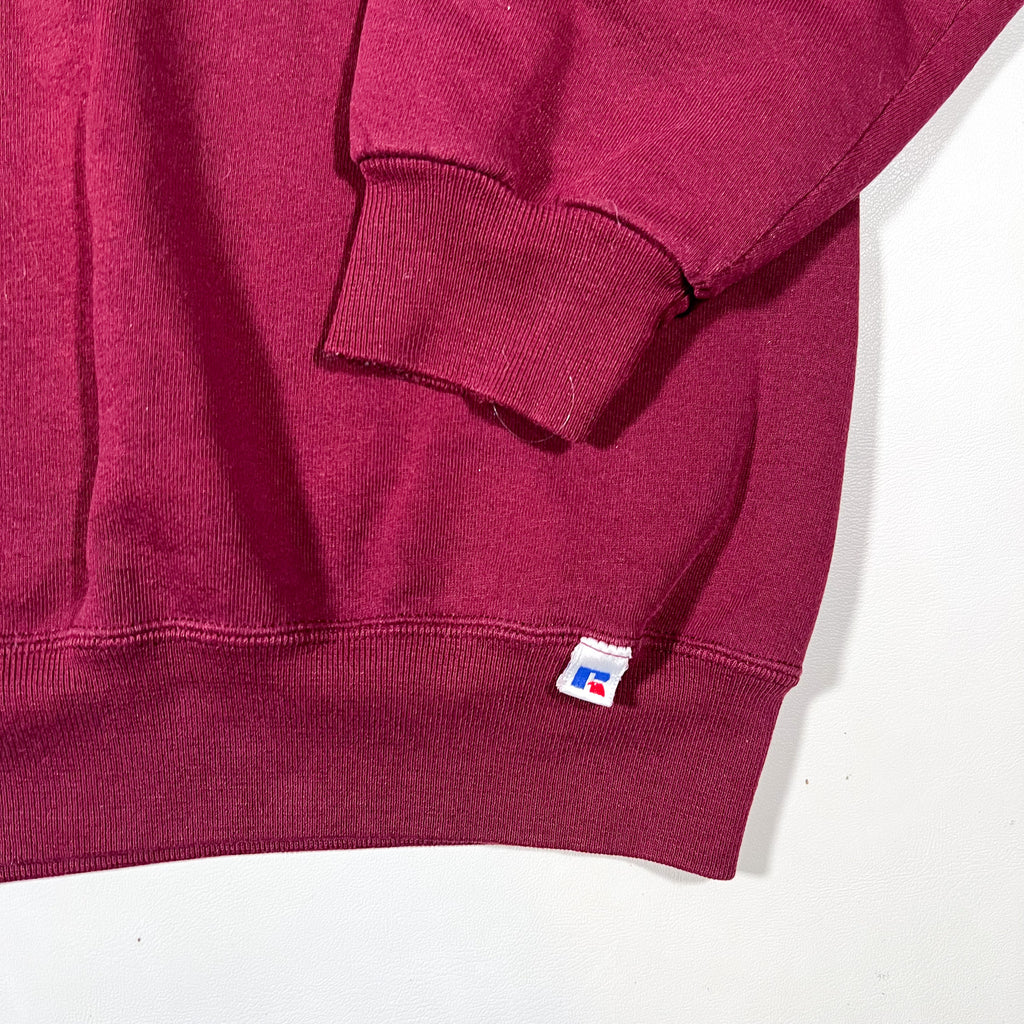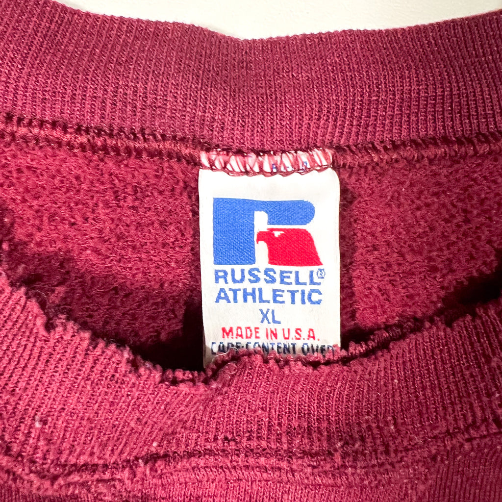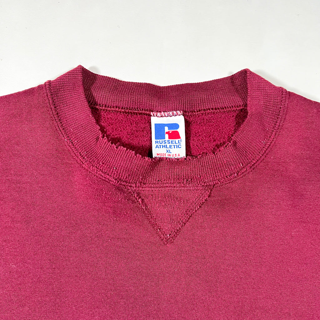 vintage sweatshirt, 90s crewneck, Russell Athletic USA, maroon crewneck, distressed sweatshirt, vintage blank, retro streetwear, made in USA, heavyweight fleece, CobbleStore Vintage