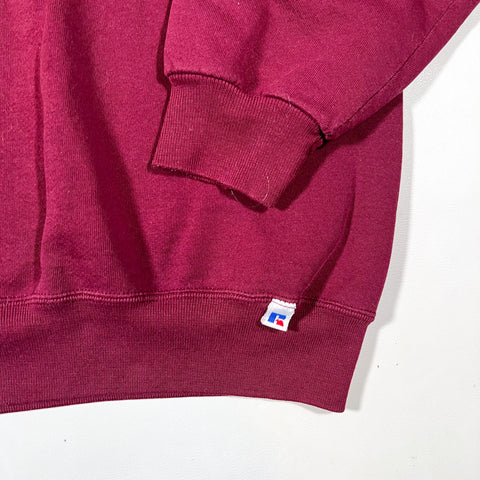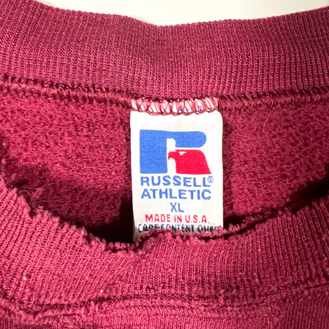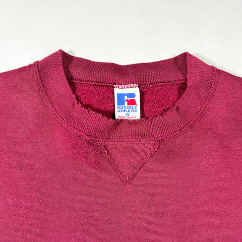 Classic vintage 90's Russell Athletic crewneck in a rich maroon color. Features the signature V-stitch at the collar, soft fleece interior, ribbed cuffs and hem, and the Russell “R” flag tag at the waist. Made in the USA and built with that thick 90’s cotton feel collectors love.