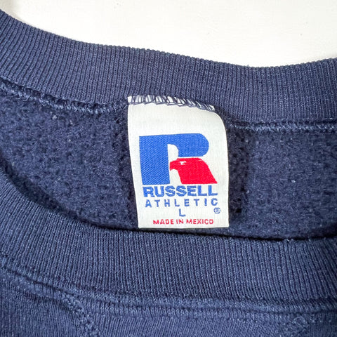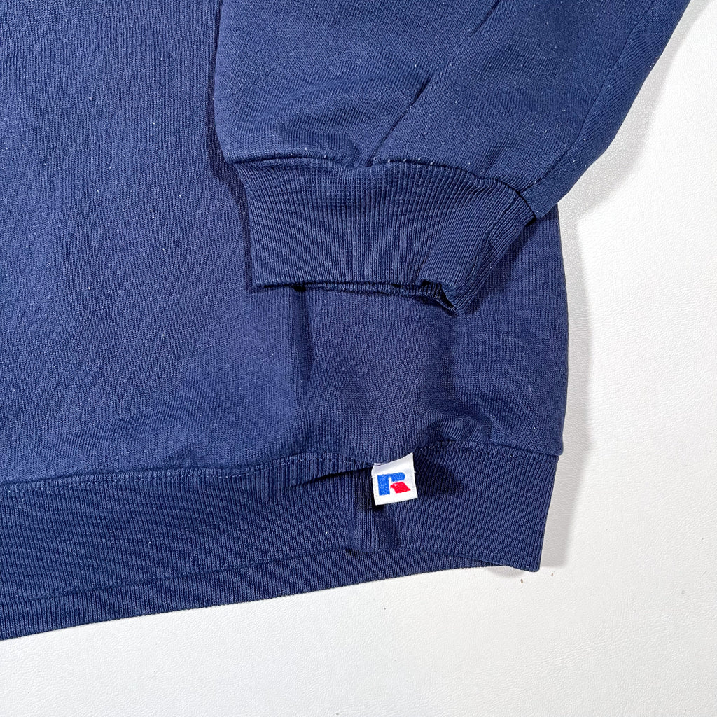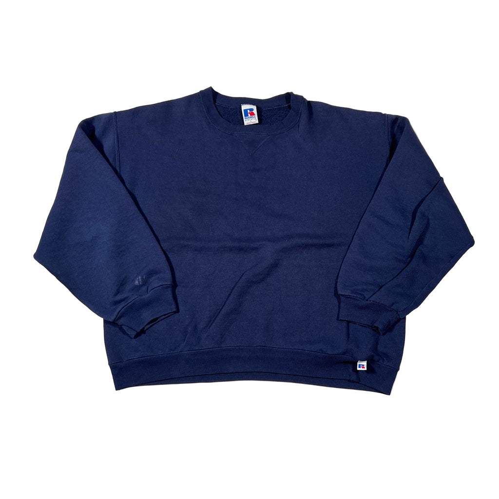 Classic vintage 90's Russell Athletic crewneck in deep navy. Heavyweight fleece interior, ribbed cuffs and hem, and the iconic Russell “R” flag tag at the waist. A clean, timeless blank — perfect for everyday wear or for screen printing.