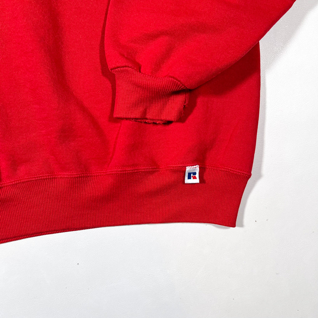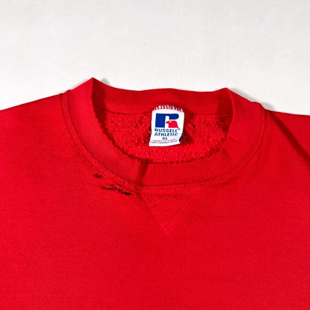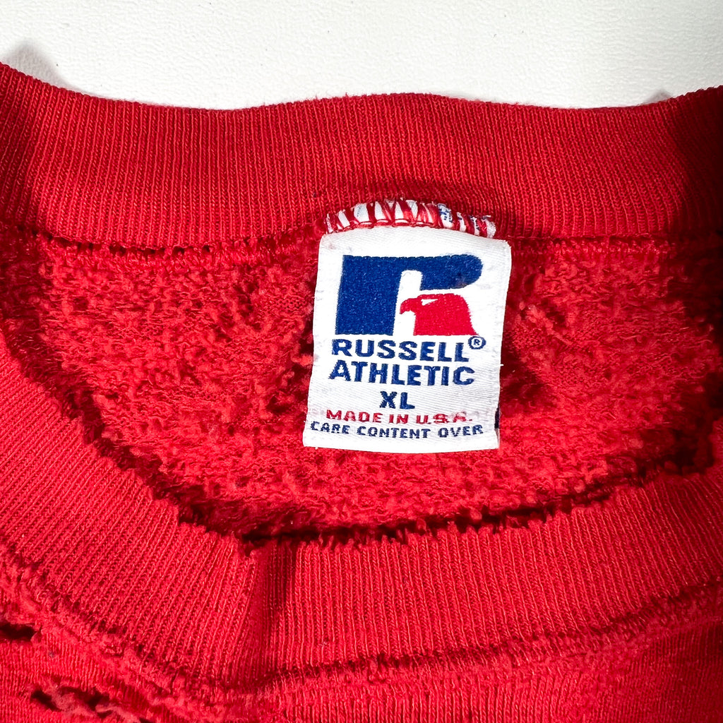 Bold vintage 90's Russell Athletic crewneck in a vibrant red. Features the classic V-stitch at the collar, soft fleece interior, ribbed cuffs and hem, and the small Russell flag tag at the waist. Made in the USA — a harder-to-find detail collectors love.