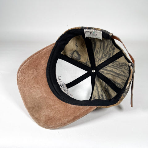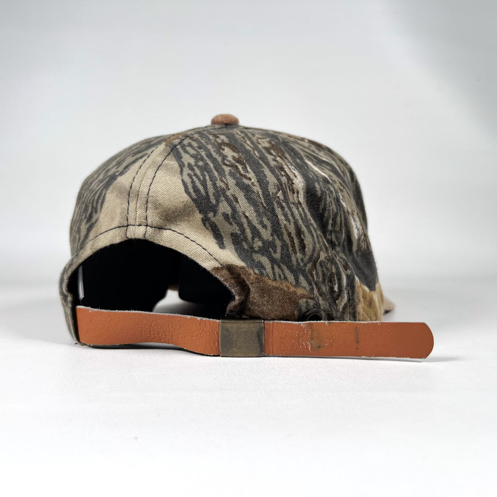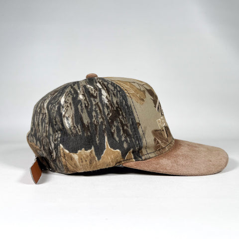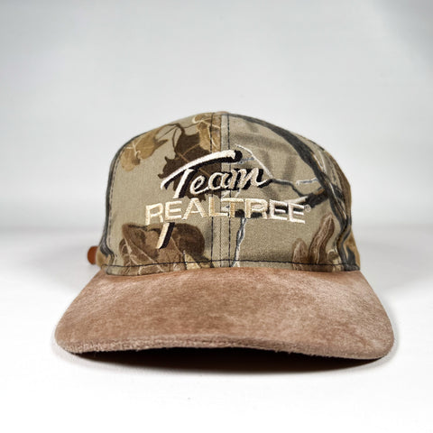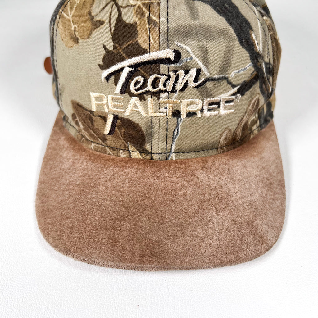Vintage Team Realtree camouflage hat with a soft brown suede bill and classic outdoor embroidered front hit. Features the iconic Realtree pattern all around with an adjustable leather strapback closure for the perfect fit. Great for hunting enthusiasts, outdoor lifestyle collectors, camo fans, or anyone who loves authentic 90s to early 2000s sportsman apparel.