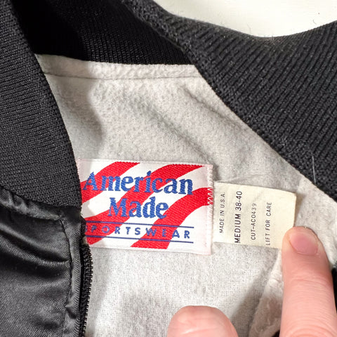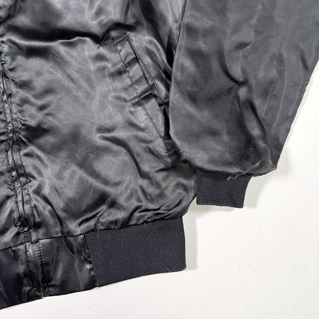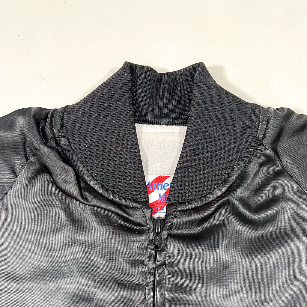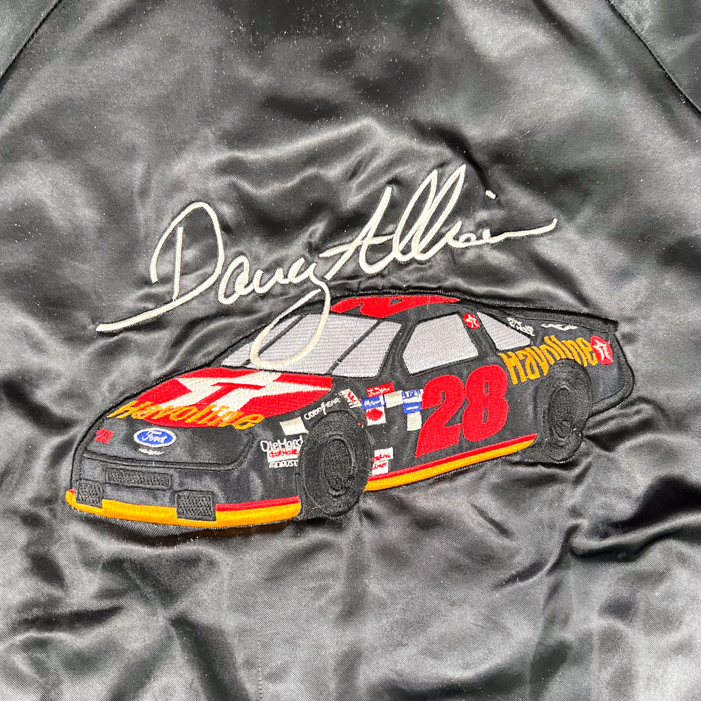 Classic 90’s Texaco Havoline Racing satin bomber featuring the embroidered Davey Allison signature hit on the front and a huge #28 race car graphic across the back. Shiny black satin shell, ribbed cuffs/hem, and soft fleece lining. Made in the USA by American Made Sportswear. A must-have piece for NASCAR collectors and fans of one of the sport’s most iconic drivers.