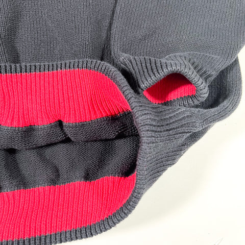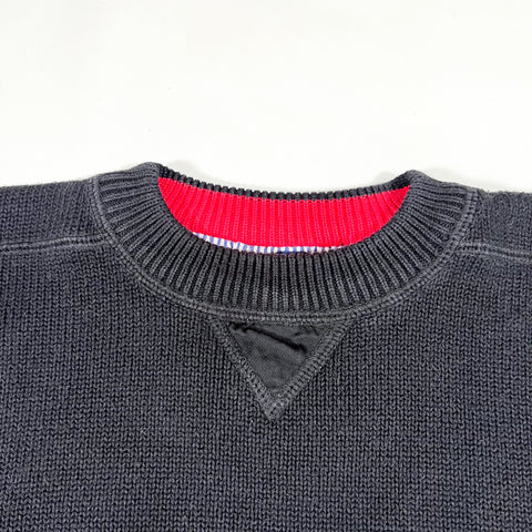 Vintage 1990s Tommy Hilfiger navy knit sweater featuring the signature embroidered crest logo at the chest and a red contrast lining inside the collar. The neckline includes a distinctive V-insert detail backed with striped cotton fabric — a hallmark of classic 90s Hilfiger design.