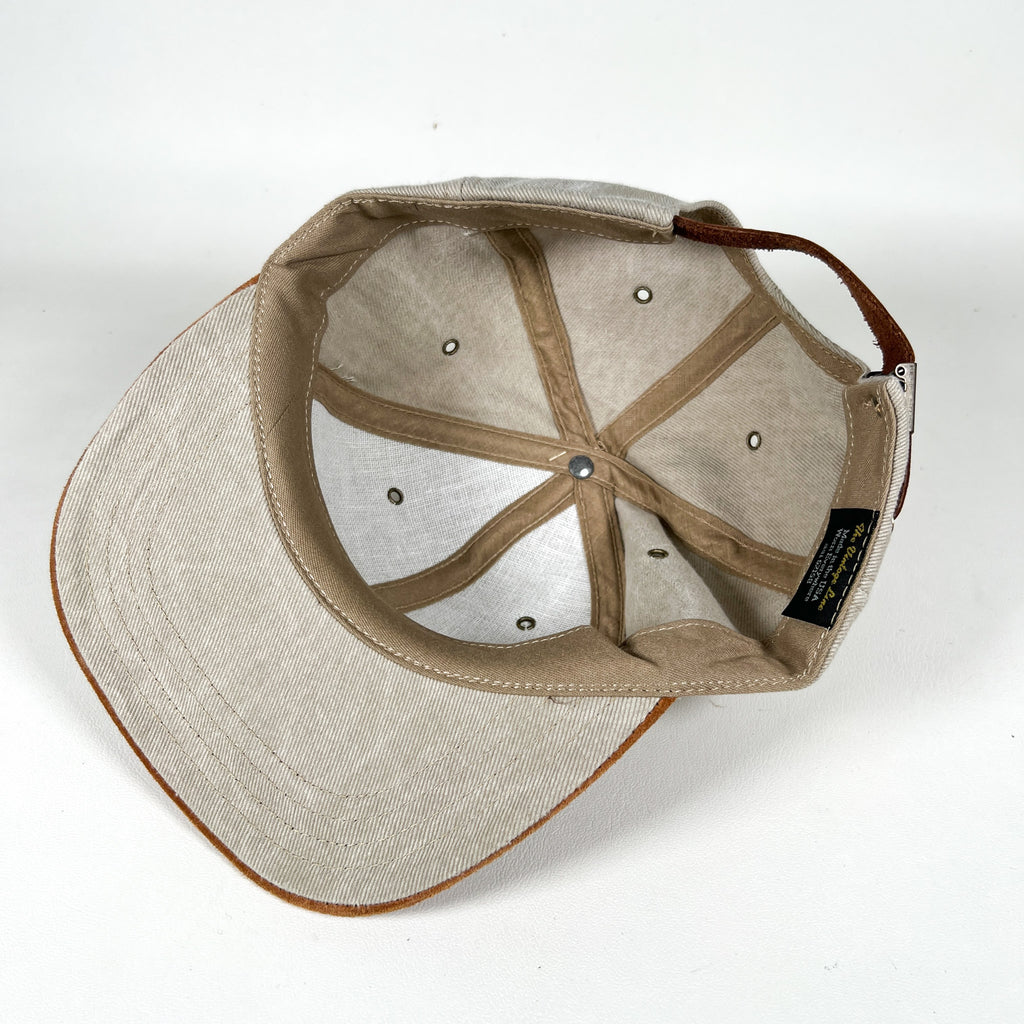 The hat features a natural cotton crown with a soft brown suede brim, embroidered Top-Flite logo on the front, and an adjustable leather strapback with brass hardware. A true golf and sportswear collectible, especially unique given its sample status.