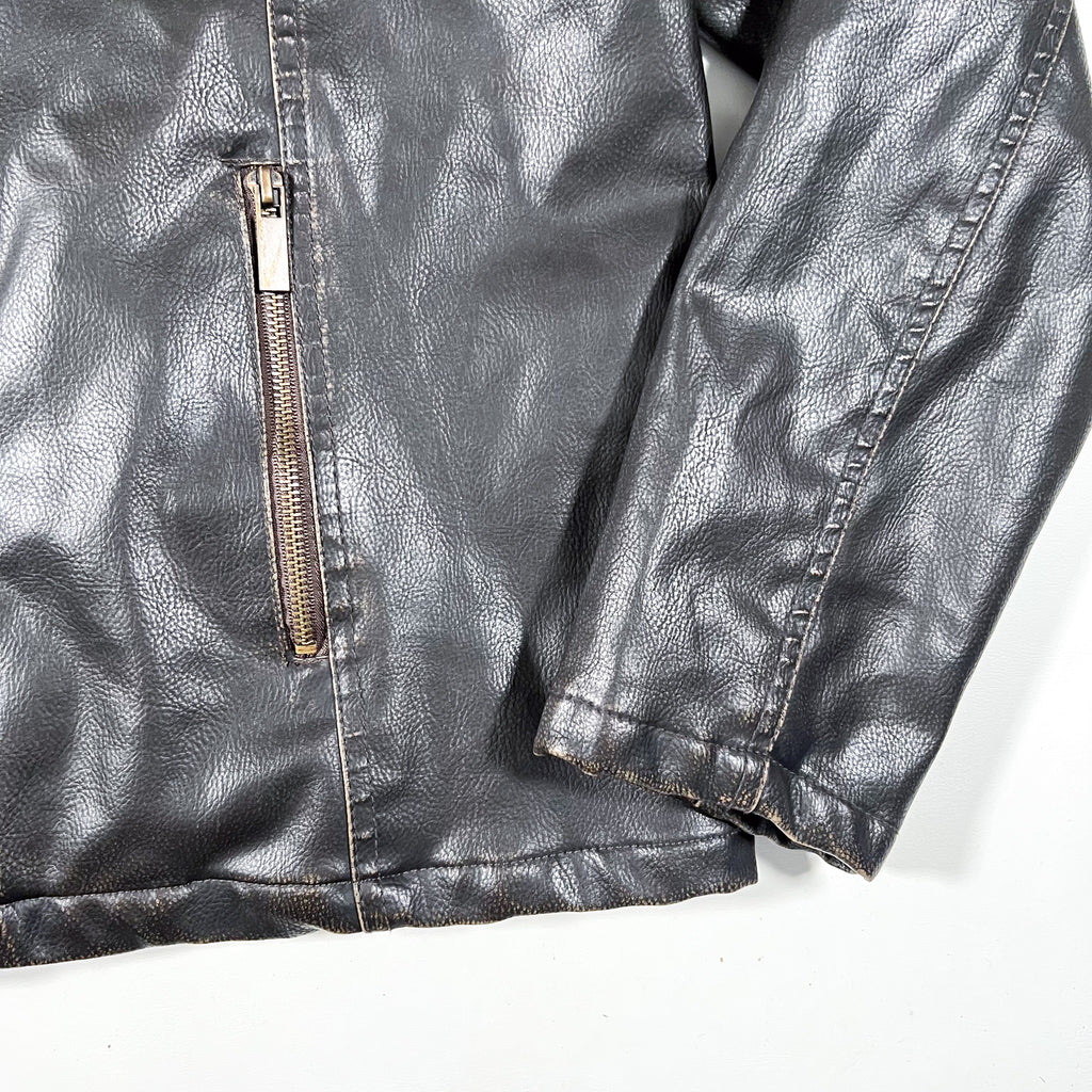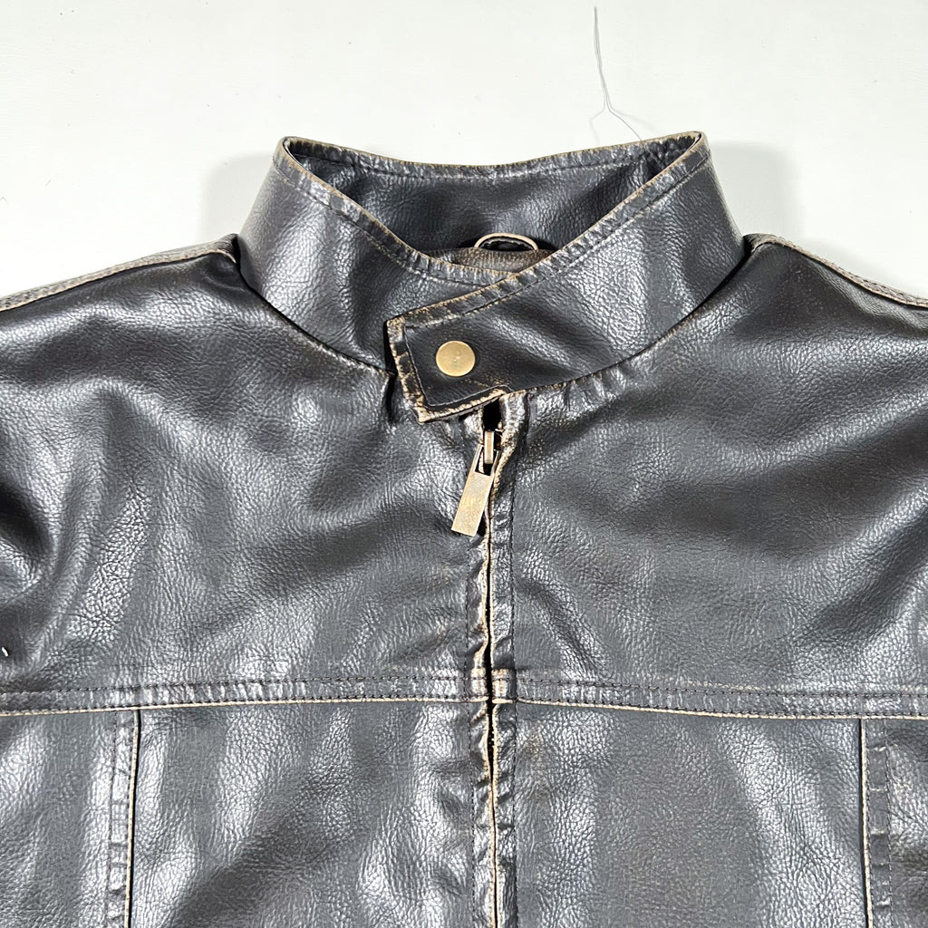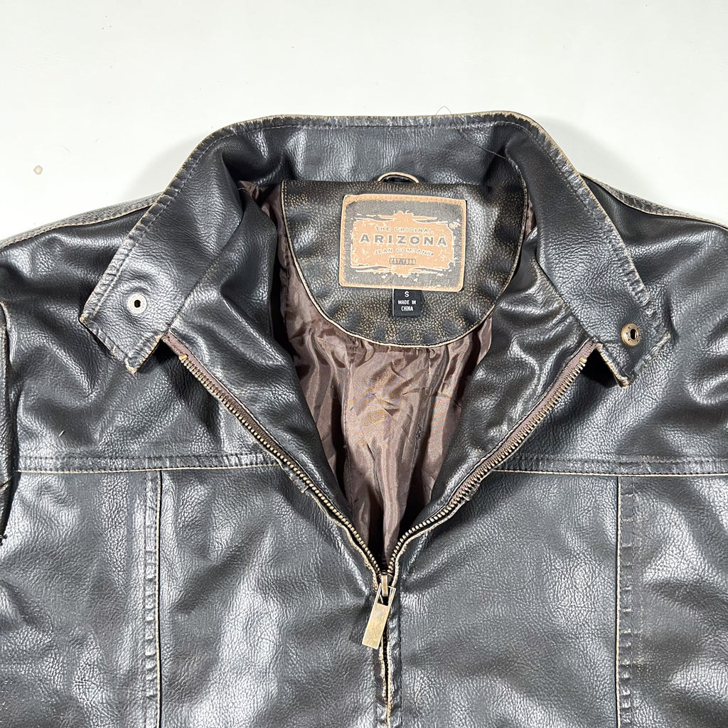 Vintage Y2K Arizona Jeans Co. faux leather moto-style jacket in a very dark brown finish. Features a snap-tab stand collar, full zip front, and zippered hand pockets. Subtle distressed edges give it that early-2000s rugged look. Lightweight lining makes it great for layering without the bulk.