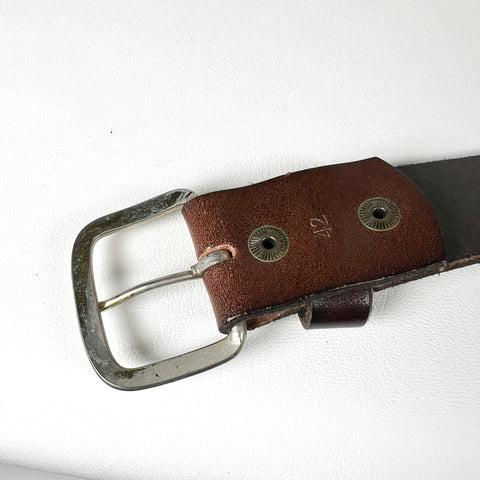Vintage Y2K-era genuine leather belt in a deep brown tone with a sleek silver buckle and brass hardware accents. Features a snap-on buckle design, allowing you to easily swap buckles for different looks — a hallmark of early 2000s style.