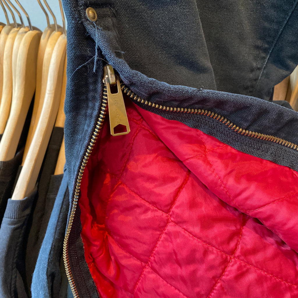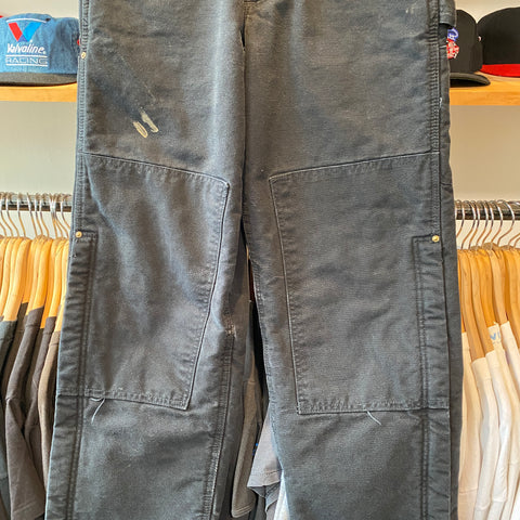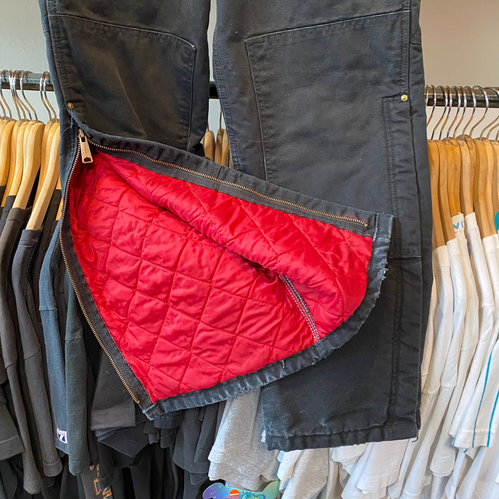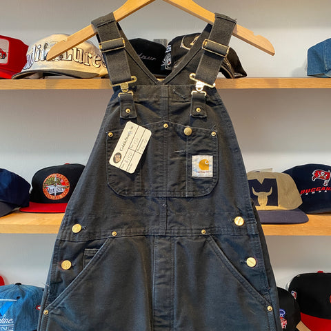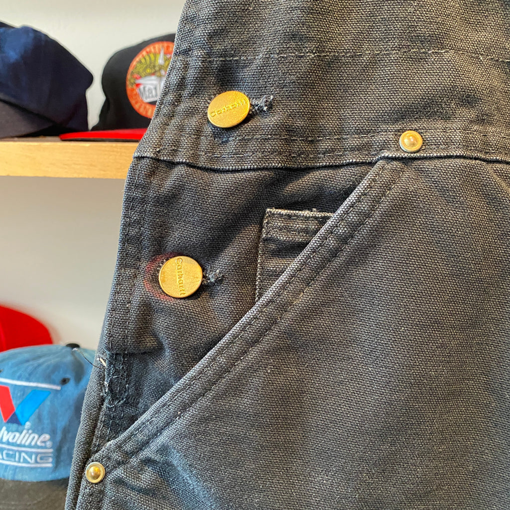 Authentic vintage Y2K-era Carhartt duck canvas bib overalls in classic black. Heavyweight cotton duck construction with adjustable shoulder straps, brass hardware, reinforced knees, and multiple utility pockets for everyday workwear function. This pair shows natural wear and light fading throughout, giving them a great broken-in look and feel that’s perfect for vintage workwear styling.