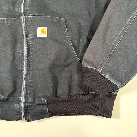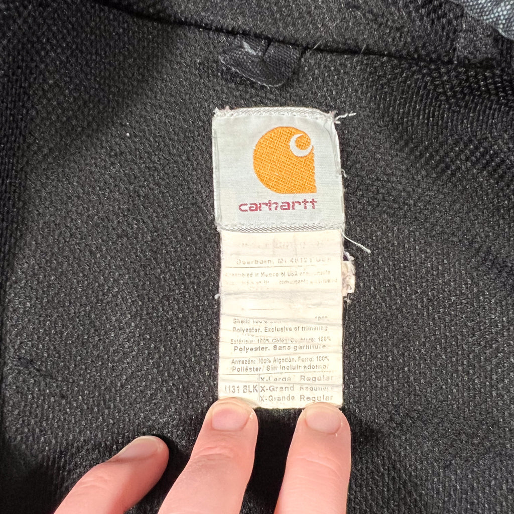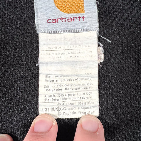 Classic early-2000s Carhartt J131 Active Jacket in Black (BLK). Heavyweight cotton duck shell with a quilted flannel lining, rib-knit cuffs and hem, and the original Carhartt brass zipper. Labeled XL Regular, but fits oversized — wears comfortably on an XL to XXL frame. A staple Y2K workwear piece with decades of life left.