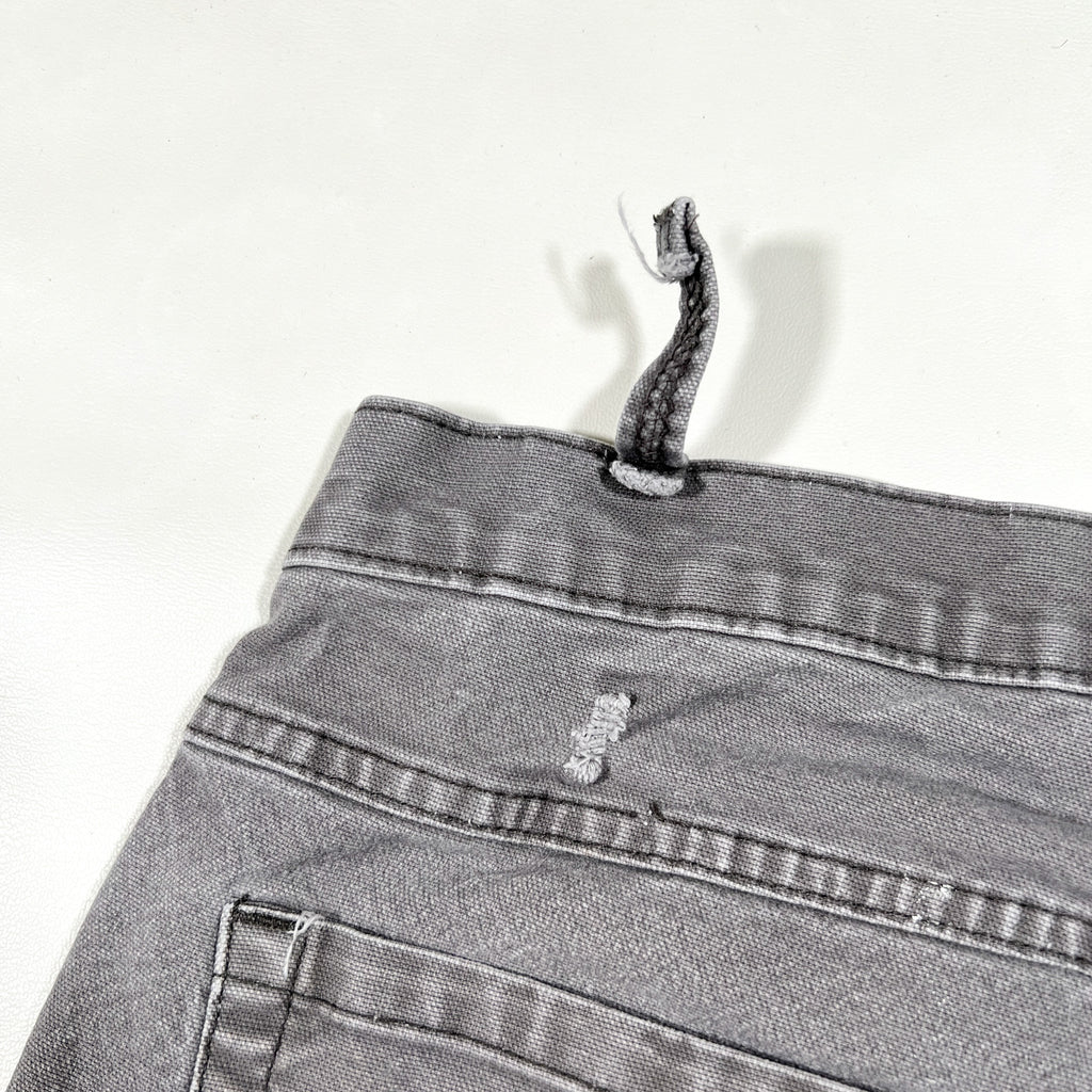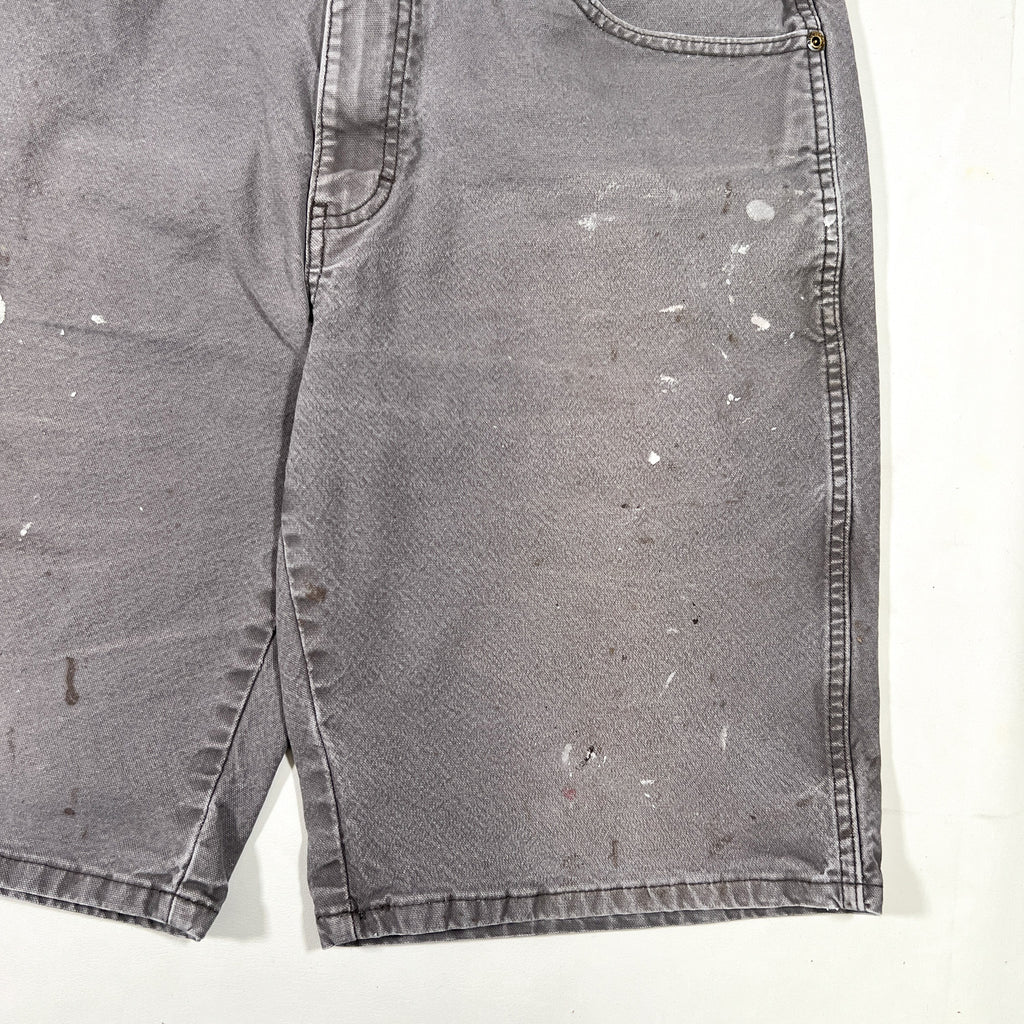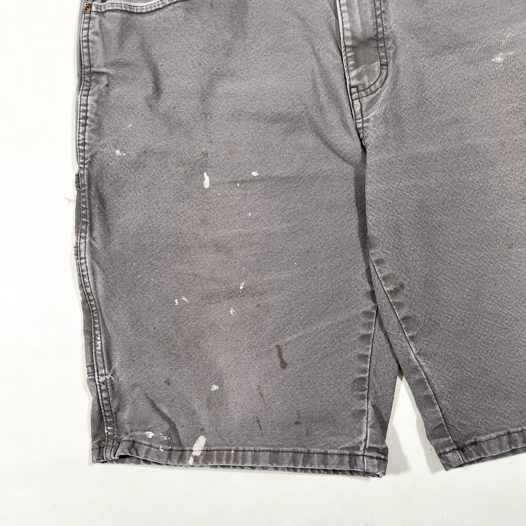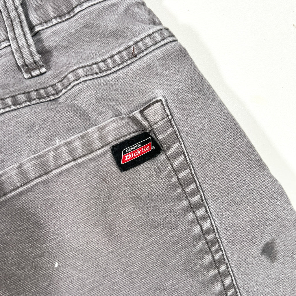 Vintage Y2K Dickies carpenter shorts in a faded gray wash. Classic durable workwear construction with utility pocket and relaxed fit. Features natural paint splatter and wear throughout, giving them a well-worn, authentic look.