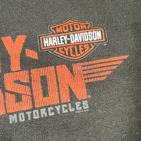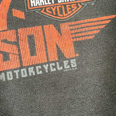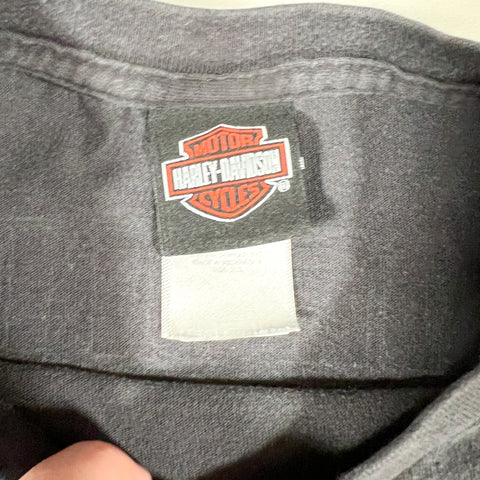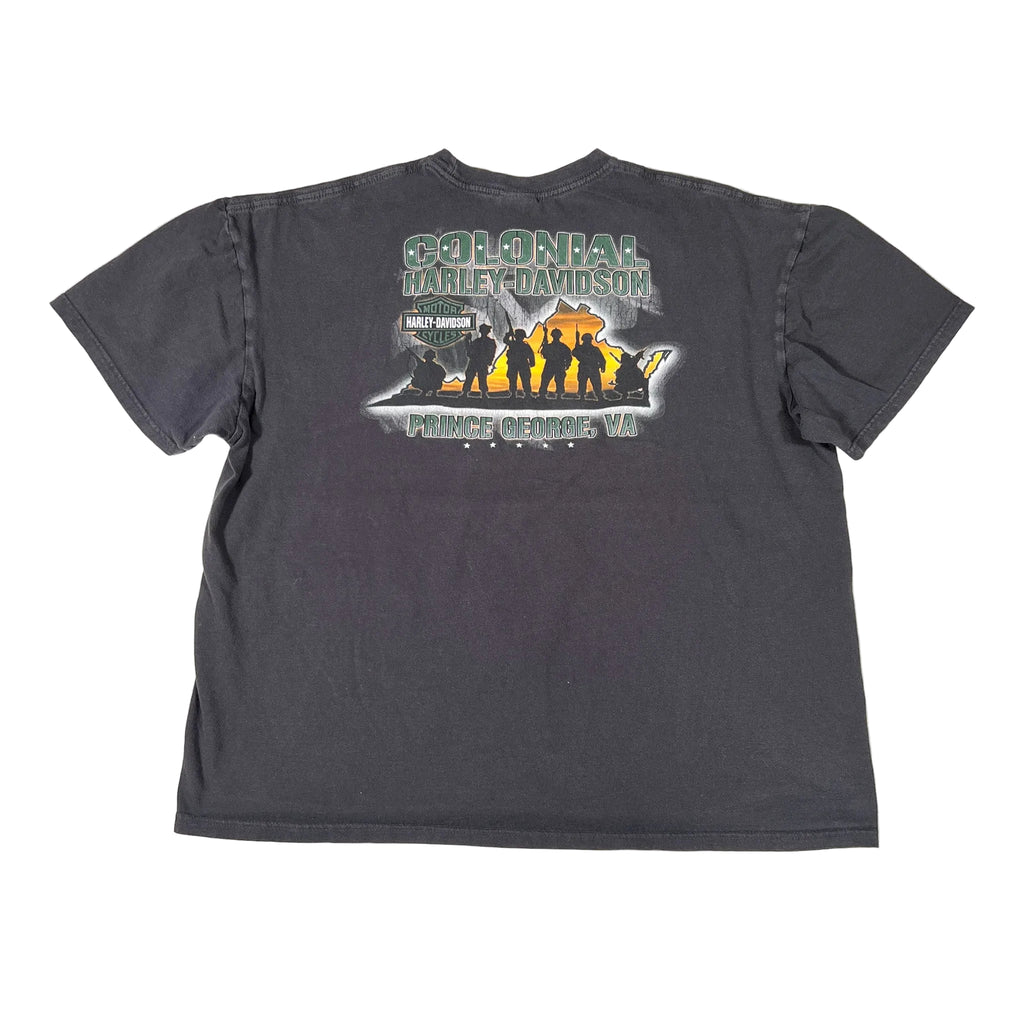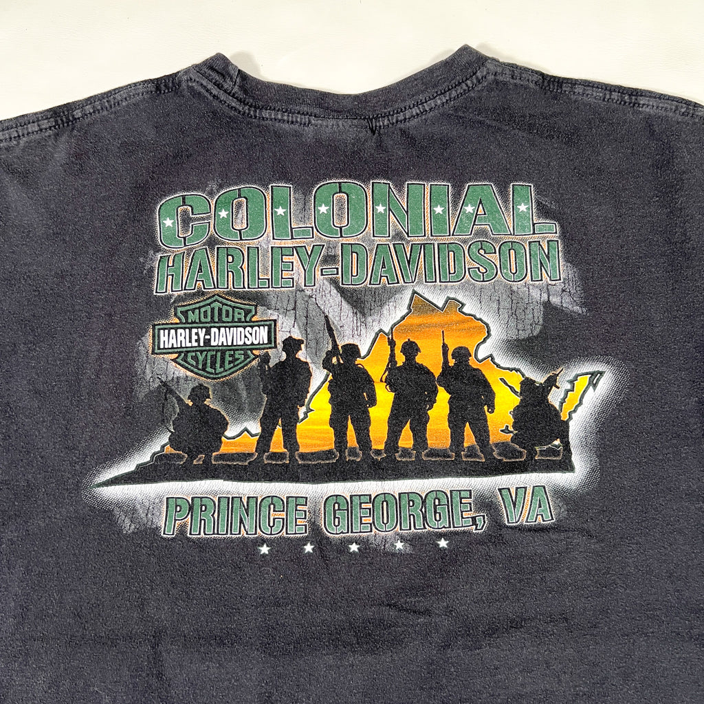 Authentic early 2000s Harley-Davidson dealer t-shirt featuring a bold front chest logo and a large back graphic from Colonial Harley-Davidson in Prince George, Virginia. Classic Y2K era Harley tee with a faded black wash and strong orange and green print hits. The back graphic features a patriotic military-themed silhouette scene with the Harley-Davidson shield, making this a standout collector piece for Harley and dealer-graphic fans.