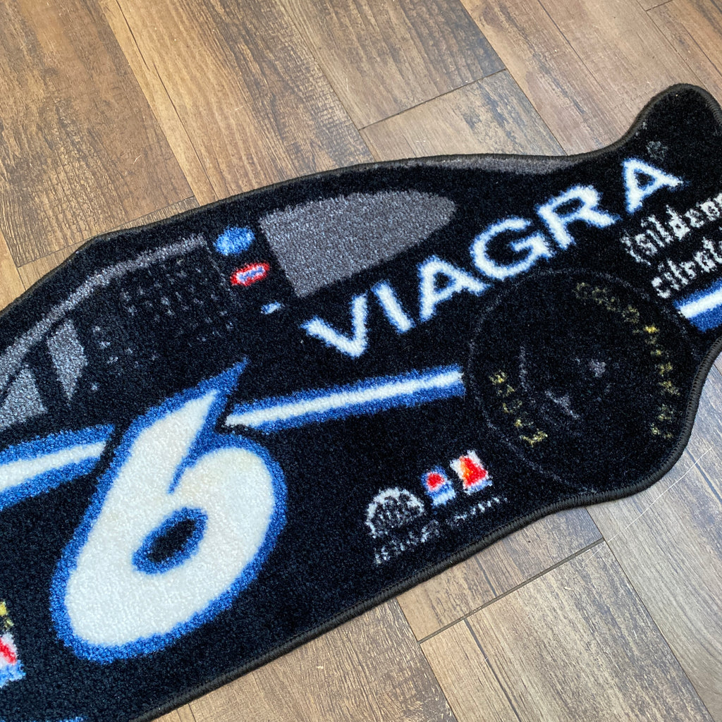 Awesome vintage NASCAR collectible rug shaped like Mark Martin’s iconic #6 Viagra Ford Taurus stock car. Features bold blue, white, and black graphics with detailed sponsor logos (3M, Goodyear, etc.) and the unmistakable “VIAGRA” livery across the side.
