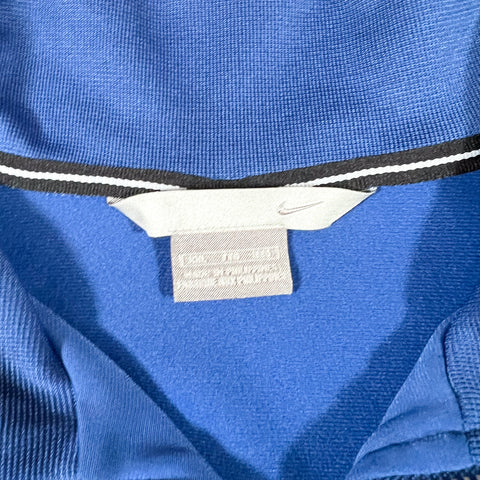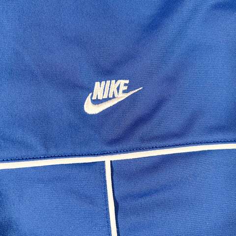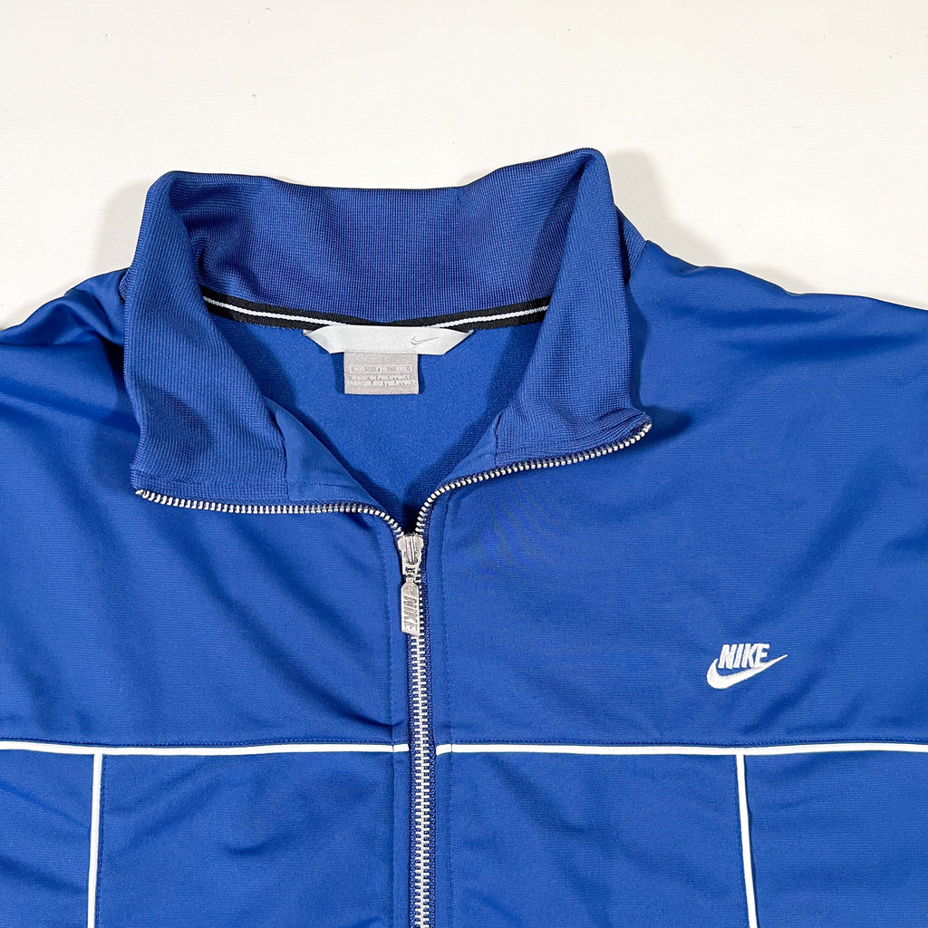 Clean Y2K Nike full-zip track jacket in a bold royal blue with white piping and classic embroidered Nike spell-out swoosh. Lightweight poly construction with a double-zip front, stand collar, and hidden side pockets. Tagged XL but fits oversized like an XXL.