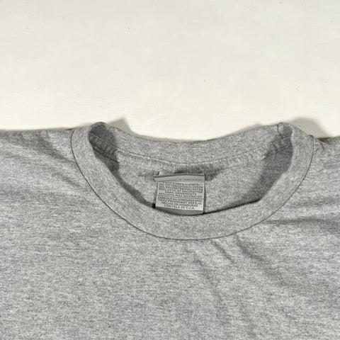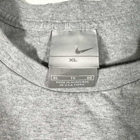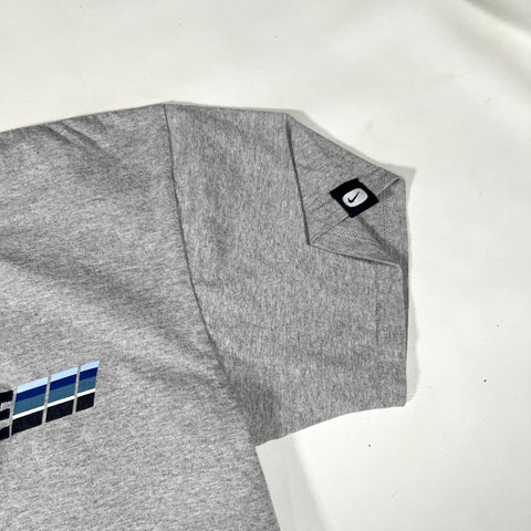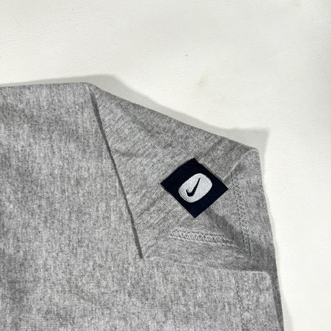 Authentic vintage Y2K-era Nike graphic T-shirt featuring the classic striped bar logo with bold “NIKE” text across the chest and an embroidered swoosh patch on the sleeve. Clean early-2000s athletic streetwear piece with a timeless gray base that pairs easily with denim or cargos. Nice mix of subtle branding and graphic design, perfect for everyday wear or Y2K-inspired fits.